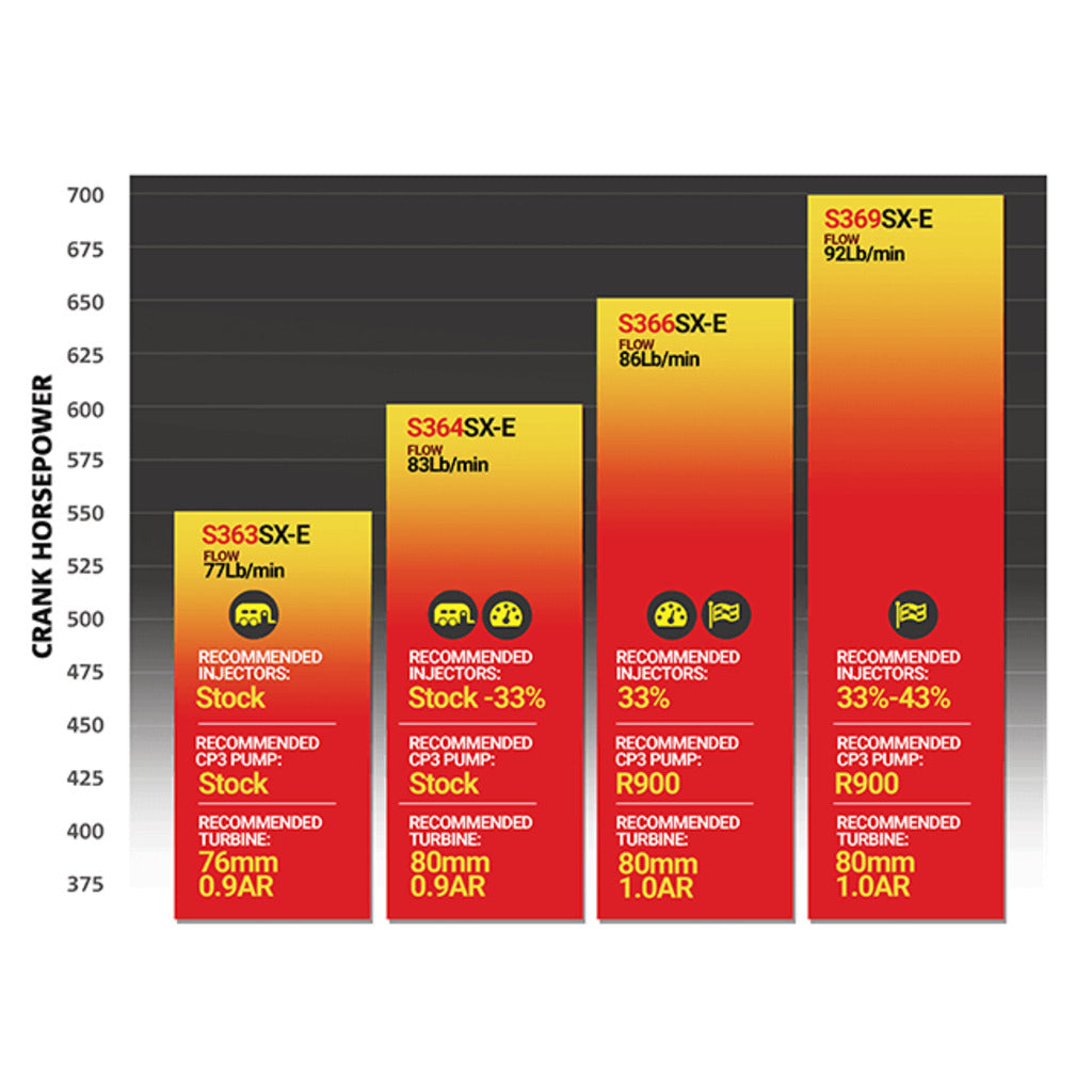 BD Single 300 series SX-E Borg Warner turbos kits that replace your OEM VGT turbo, providing enough air for more power, response and reliability; Turbo utilizes high flow T4 turbine housing; The SX-E turbo was designed for performance with a 360 thrust bearing and enhanced compressor wheel and housing; The high strength FMW Forged Milled Wheels are lighter and stronger and withstand higher wheel speeds ; Kit comes with BD's Performance Plus T4 6.7L exhaust manifold and gaskets; No extra piping required, it drops in place for an easy, clean installation ; Comp Wheel: 66mm 2.60in; Turbine Wheel: 80mm 3.15in; A/R Ratio: 1.00; Flow: 87 Lb/min; Approximate rated 650hp (depending on truck configuration)