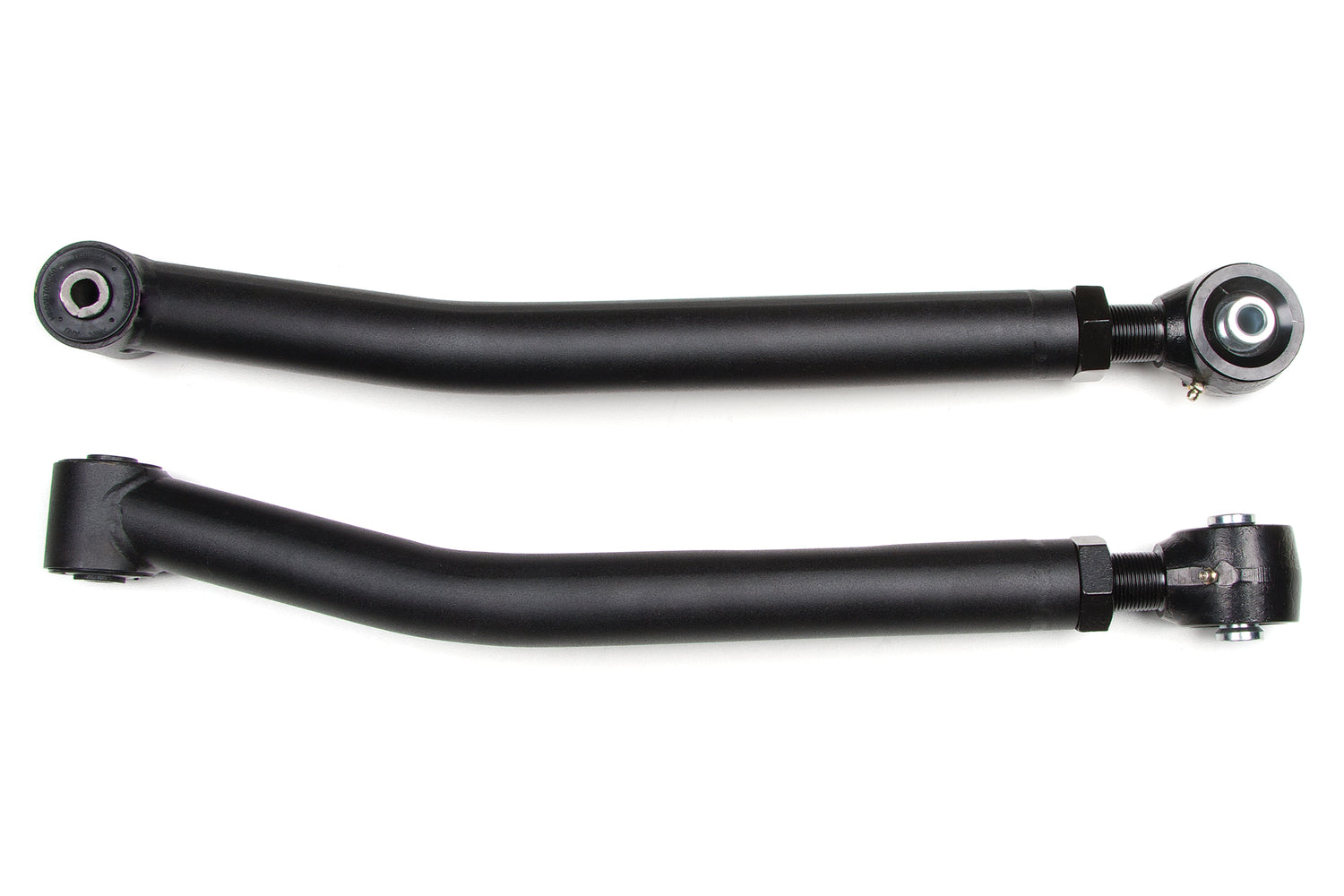 At the axle end they utilize an OE-style rubber bushing for long service-free operation and better isolation of noise, vibration, and harshness (NVH). At the frame mount they feature a large, forged flex end for strength, durability, and off-road articulation. The forged flex ends allow length adjustments to correctly position the front axle and correct caster. Capable of 15-degrees of misalignment in either direction for more flex out on the trail.