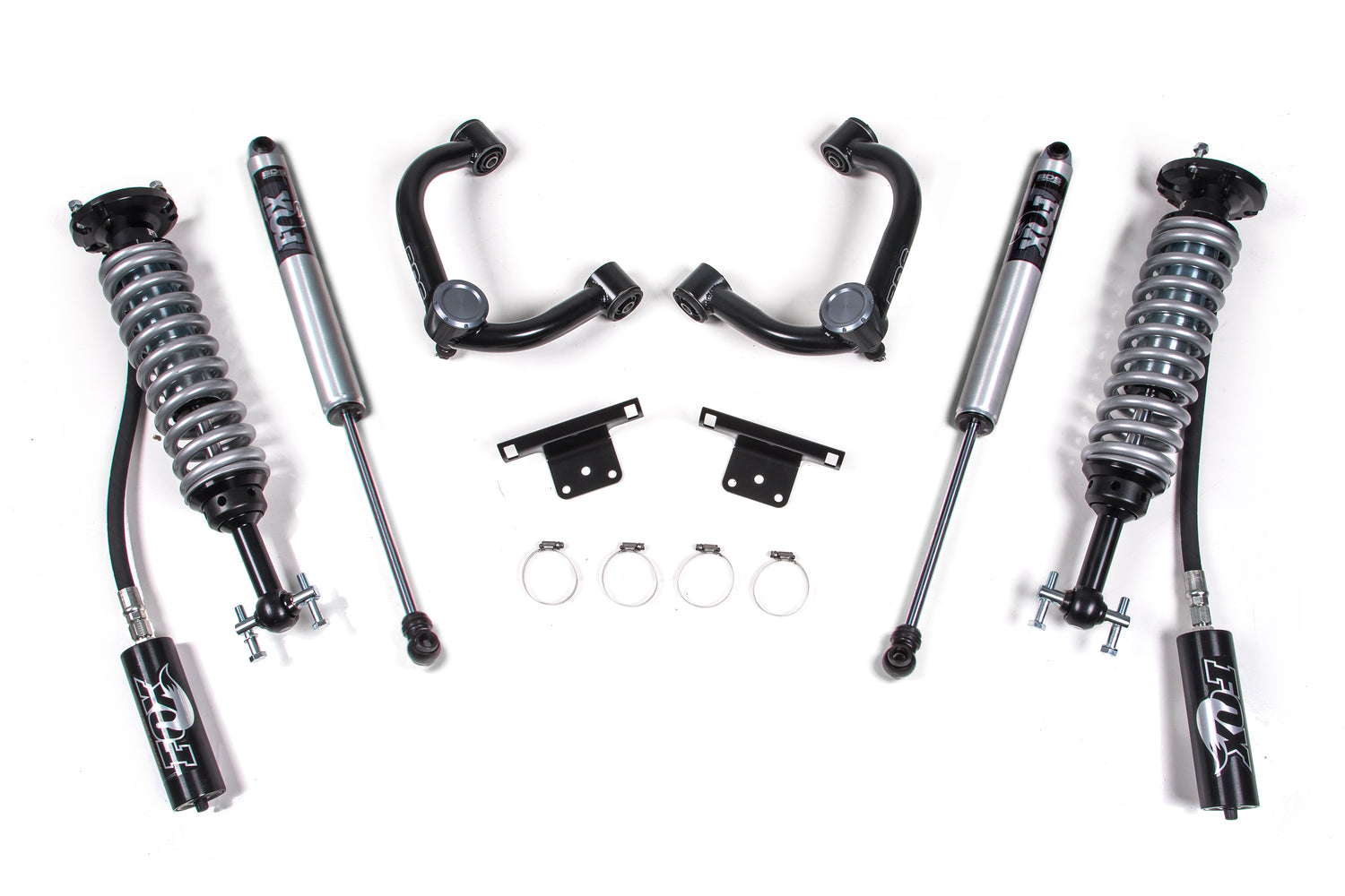 Up front the lift kit includes FOX 2.5 Factory Series remote reservoir coil-over shocks and heavy duty tubular upper control arms for increased strength. In the rear this kit utilizes a complementary set of FOX 2.0 Performance shocks for the smoothest ride.