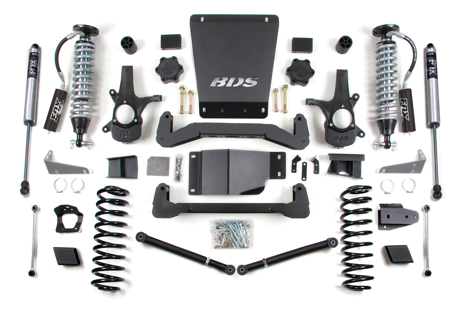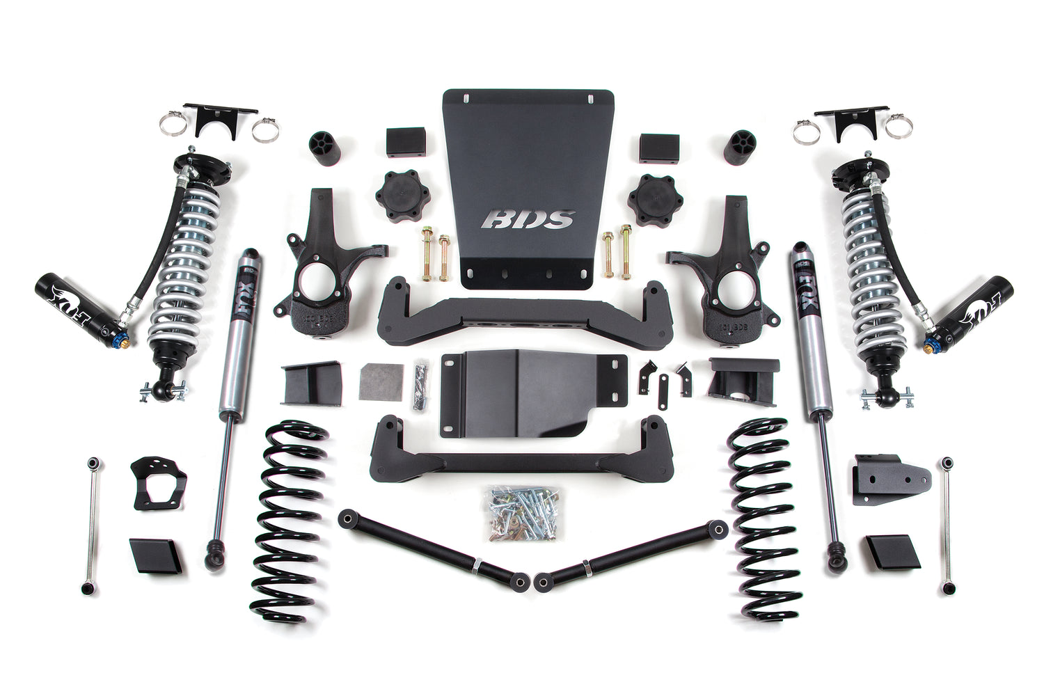 Upgrade the performance and capability of your 2007-2014 Chevy Avalanche, Suburban, or Tahoe and GMC Yukon 1500 with 6-inch coil-over suspension lift kit by BDS. These kits feature proprietary FOX 2.5 coil-over shocks designed specifically to bolt-on performance for increased travel and the ability to soak up the roughest terrain along with smooth on-road comfort. Designed to improve stance, performance, and capability, this kit includes everything necessary to set your truck up right with clearance for up to 35" tires