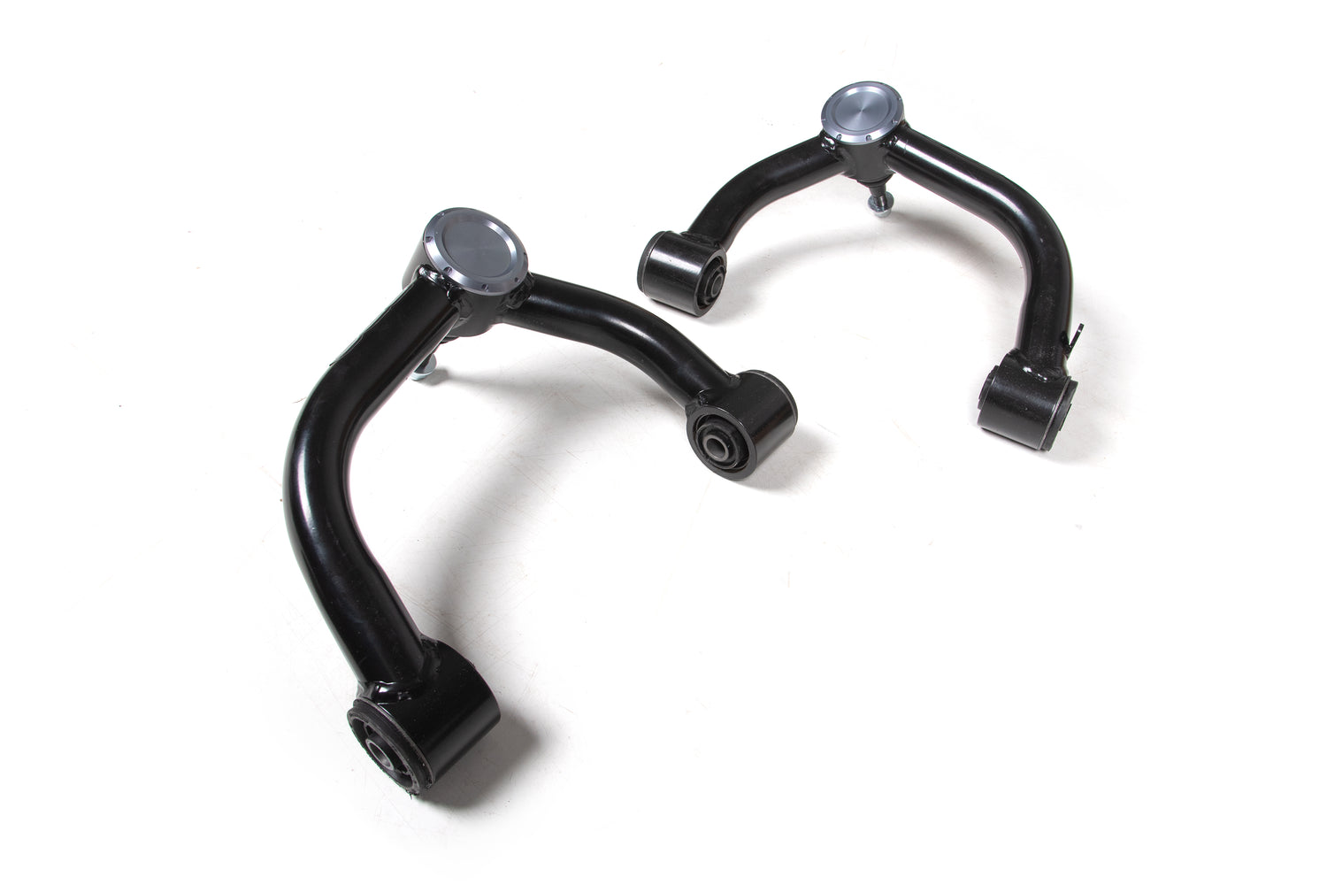 Built for strength, performance and increased travel, these upper control arms are ready to bolt-in with most leveled/lifted trucks. They use 1.5"" OD x .120-wall tubular construction with an indexed ball joint cup to correct the ball joint positioning allowing additional down travel and camber adjustment. At the frame mounting ends are durometer-specific rubber bushings for maintenance-free operation while at the other end a quality greaseable ball joints for smooth, quiet operation and superior durability. Arms are finished in a durable black powder coat with a billet aluminum dust cap ready for installation right out of the