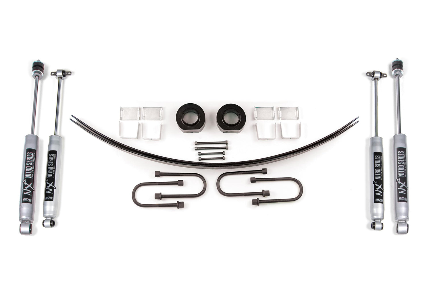The lift kit includes two front 1-3/4 inch urethane coil spring spacers, long rear thin add-a-leaf springs, and NX2 Nitro or FOX Performance series shocks. Give your Cherokee XJ the extra height with this 1-3/4 inch lift kit from BDS Suspension.