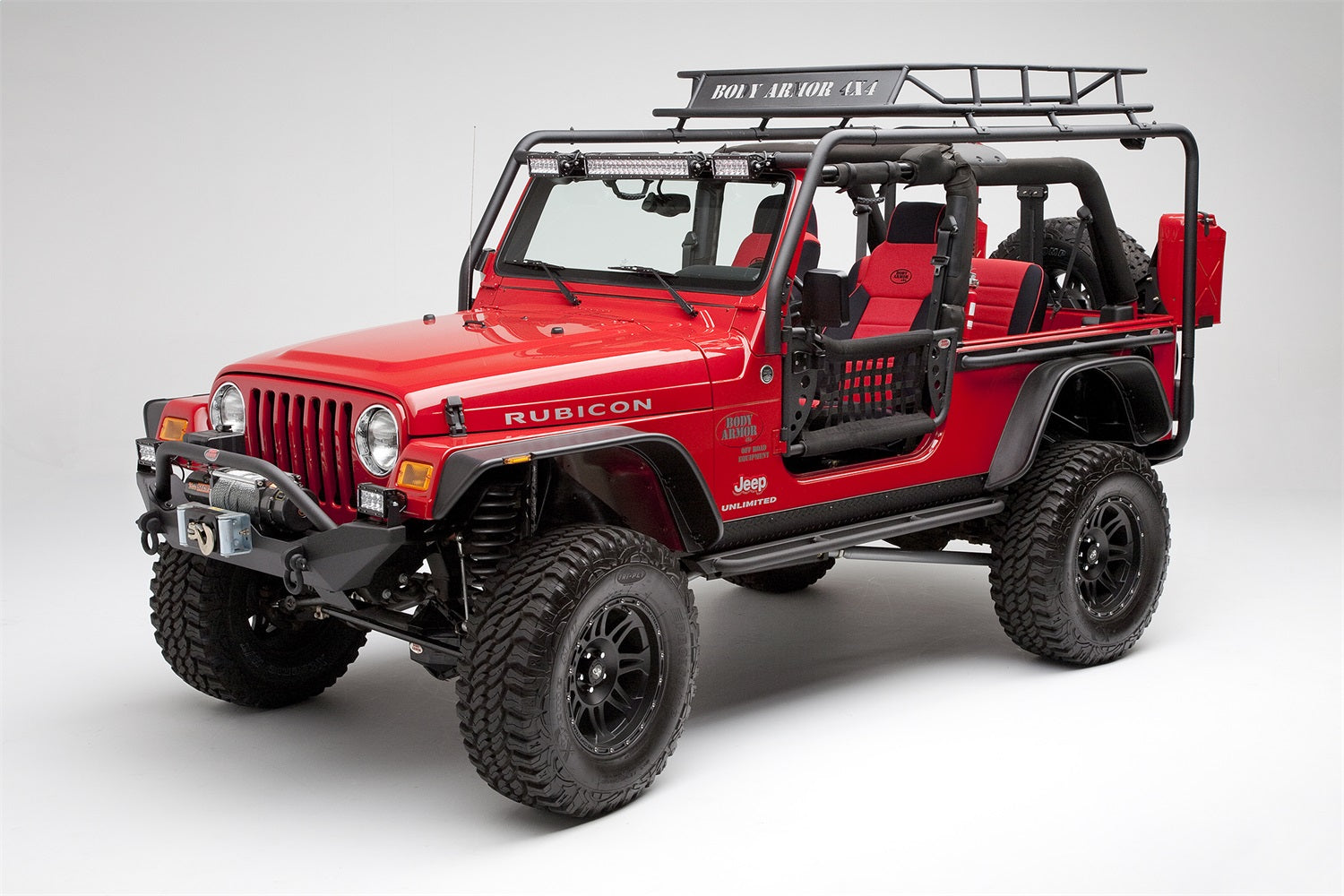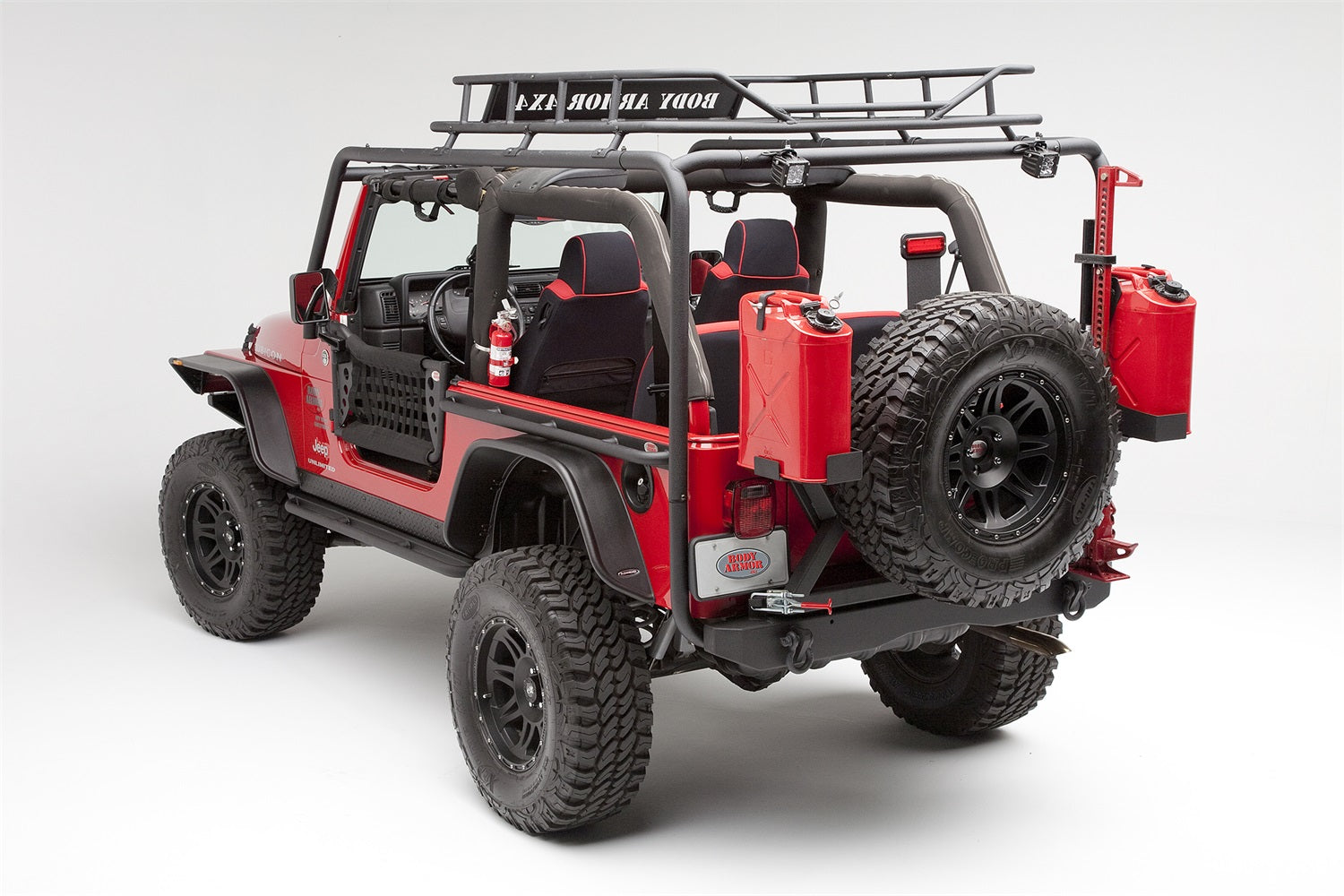 Body Armor 4X4's new Roof Rack Base Kits are made from 2 in. .120 wall steel tube and feature a durable textured black powder coat finish. The simple bolt together design uses grade 8 hardware with front and rear light bars as standard features. This base is specifically designed to accept the Body Armor Cargo Basket, and engineered to hold up to the rigors of the trail. With this new rack you can retain the ability to retract your soft top, even with the base rack installed (requires removal of cargo basket though). You can also easily remove your hard top with the base rack and cargo basket installed as well.