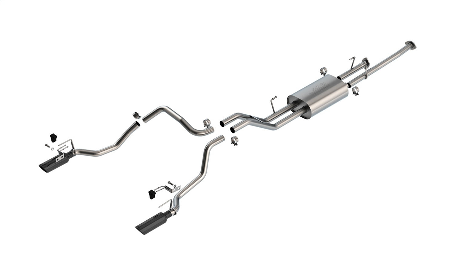 This BORLA® 2.25 in. diameter Cat-Back™ system is a True Dual, split rear exit, with single 4 in. round black chrome on T-304 stainless steel tips on each tail pipe. Using BORLA® Stainless Steel Polish p# 21461 is NOT recommended with these black chrome tips. We suggest cleaning the tips with hot water and a microfiber cloth. A system with bright chrome on T-304 stainless steel tips is also available. This system gives the Tundra a great look, pure performance V-8 growl, and a nice performance kick. The muffler contains an internal H-Pipe for increased performance and improved sound. The system delivers the mellow Touring sound with no drone inside the vehicle. The full dual system even weighs less than the factory single system, thanks to the lightweight T-304 stainless steel fabrication and, not surprisingly, out flows the stock exhaust. It even exhibits better fuel economy numbers which is nice for a big truck. BORLA® Cat-Back™ & Axle-Back exhaust systems feature patented straight-through and multi-core technology to unleash hidden horsepower. Increased exhaust velocity adds power, driving excitement, fuel economy, and the distinctive BORLA® Sound of Power respected by motoring enthusiasts everywhere. Each system is built from premium austenitic T-304 stainless steel, superior to T-400 series knockoffs (such as 409), to give you the absolute best in performance and durability. Ultra-smooth mandrel bends ensure maximum flow & power, and precision computer numerical control (CNC) manufacturing ensures an accurate fit. Best of all, BORLA® stands behind every system with a Million-Mile Warranty. Just what you’d expect from the world’s most experienced (and most winning) exhaust brand. Oversize box shipping rates apply to this system.
