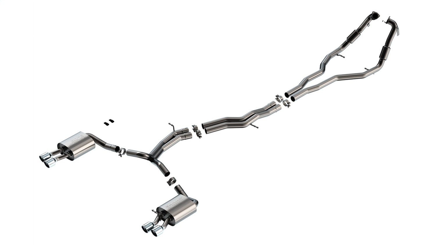 This 2.5 in. diameter BORLA® Cat-Back™ system has dual 1.75 in. diameter tail pipes. The system features a Merge X-Pipe for increased performance and improved sound. The system delivers the classic S-Type sound with no drone inside the vehicle. It INCLUDES electronic exhaust valve simulators which ELIMINATE the valves. This avoids any warning lights on the dash while providing maximum flow at all times. The system features 3.5 in. polished T-304 stainless steel tips. A system with brushed T-304 stainless steel tips is also available. BORLA® Cat-Back™ & Axle-Back exhaust systems feature patented straight-through and multi-core technology to unleash hidden horsepower. Increased exhaust velocity adds power, driving excitement, fuel economy, and the distinctive BORLA® Sound of Power respected by motoring enthusiasts everywhere. Each system is built from premium, high-quality T-304 austenitic stainless steel, superior to T-400 series knockoffs (such as 409), to give you the absolute best in performance and durability. Ultra-smooth mandrel bends ensure maximum flow & power, and precision computer numerical control (CNC) manufacturing ensures an accurate fit. Best of all, BORLA® stands behind every system with a Million-Mile Warranty. Just what you’d expect from the world’s most experienced (and most winning) exhaust brand.