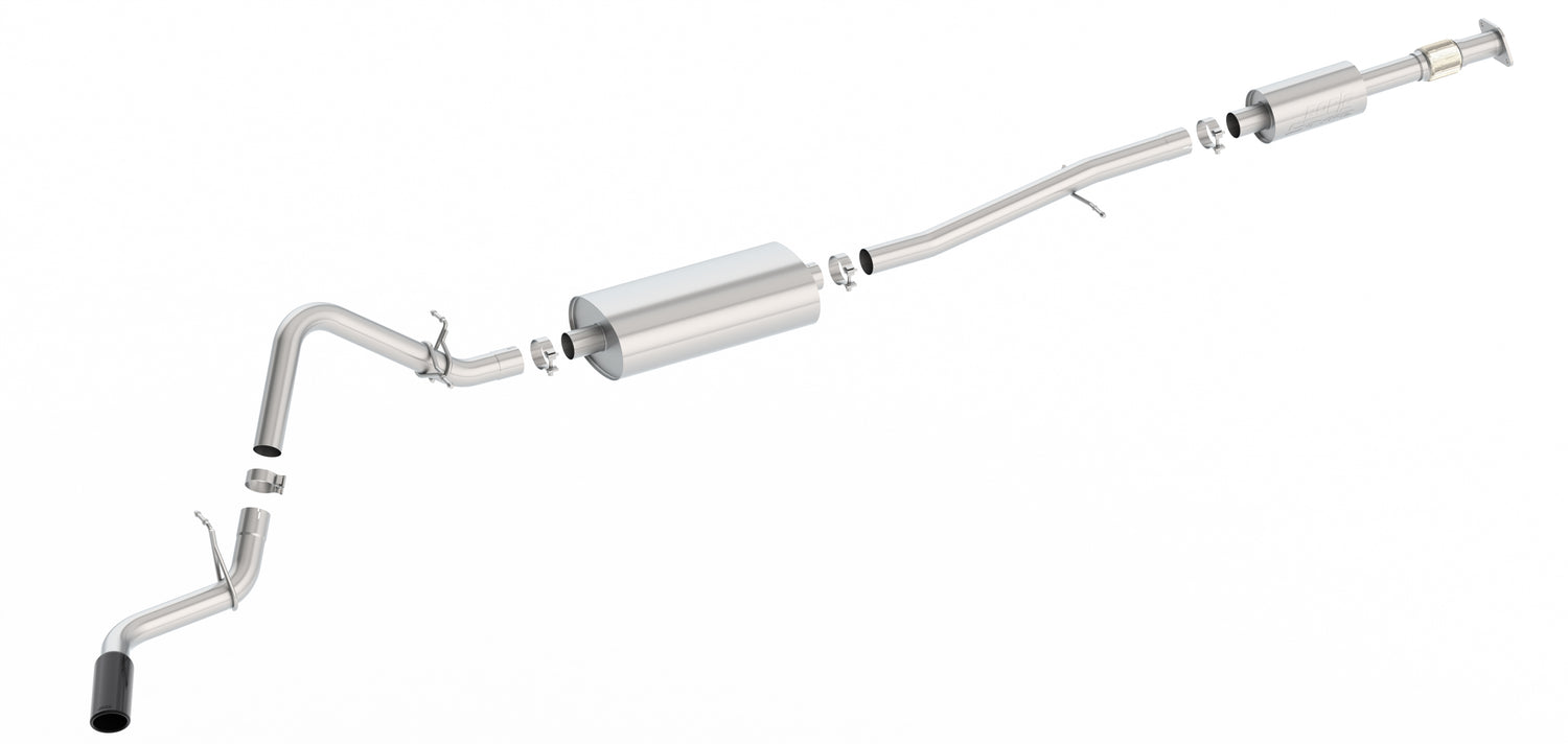 Factory Single Side Exit vehicles ONLY. Add Adapter 60708 For Crew Cab with Standard Bed (6' 7") 157" Wheelbase vehicles. This 3" Cat-Back(tm) system with the S-Type sound level will give your 2.7L Silverado and Sierra the right sound and performance without any of the annoying drone often found in four cylinder applications. The system is tuned for flow and sound on the turbo four cylinder engine of the GM 1500 trucks. This system features a single 4" black chrome on T-304 stainless steel tip. A bright chrome on T-304 stainless steel tip is also available. Using Borla(r) Stainless Steel Polish p# 21461 is NOT recommended with these black chrome tips. Borla(r) Cat-Back(tm) & Axle-Back exhaust systems feature patented straight-through and multi-core technology to unleash hidden horsepower. Increased exhaust velocity adds power, driving excitement, fuel economy, and the distinctive Borla(r) Sound of Power respected by motoring enthusiasts everywhere. Ultra-smooth mandrel bends ensure maximum flow & power, and precision computer numerical control (CNC) manufacturing ensures an accurate fit. The system is constructed using premium, high quality T-304 stainless steel which is superior to 400 series. Borla(r) exhaust systems are covered under our Million-Mile warranty with the following exceptions. Borla(r) will warranty black coatings, tip finishes, and carbon fiber parts for one year.