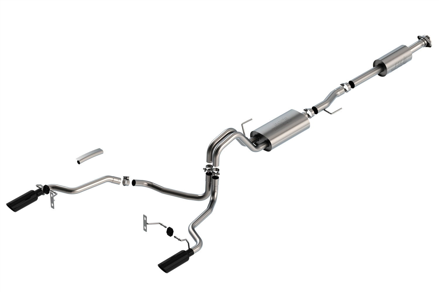 The 3" into dual 2.25" diameter Borla(r) Cat-Back(tm) system was specifically designed to enhance the power and sound of the Ford F-150 equipped with the 5.0L V8 engine. The split rear exit configuration replaces the single factory tail pipe, and has single 4" round black chrome on T-304 stainless steel tips on each tail pipe. Using Borla(r) Stainless Steel Polish p# 21461 is NOT recommended with these black chrome tips. We suggest cleaning the tips with hot water and a microfiber cloth. A system with bright chrome on T-304 stainless steel is also available. This system features the mellow Touring sound that gives you a mild sound of power with no drone. Additional systems are available with different options for sound level, tip finish and tip exits. Add adapter 60556 for Crew Cab with Standard Bed (6' 7') 157.2" Wheelbase vehicles. Add adapter 60564 for Extended Cab with Long Bed (8' 2") 164.1" Wheelbase vehicles. Borla(r) Cat-Back(tm) & Axle-Back exhaust systems feature patented straight-through and multi-core technology to unleash hidden horsepower. Increased exhaust velocity adds power, driving excitement, fuel economy, and the distinctive Borla(r) Sound of Power respected by motoring enthusiasts everywhere. Each system is built from premium, high-quality T-304 austenitic stainless steel, superior to T-400 series knockoffs (such as 409), to give you the absolute best in performance and durability. Ultra-smooth mandrel bends ensure maximum flow & power, and precision computer numerical control (CNC) manufacturing ensures an accurate fit. All this is backed by our unsurpassed Million Mile Warranty. System Features: Cat-Back(tm) System Split Rear Exit 4" Round Black Chrome On T-304 Stainless Steel Tips Touring Sound Level T-304 Stainless Steel Construction Bolt-On Installation Million Mile Warranty