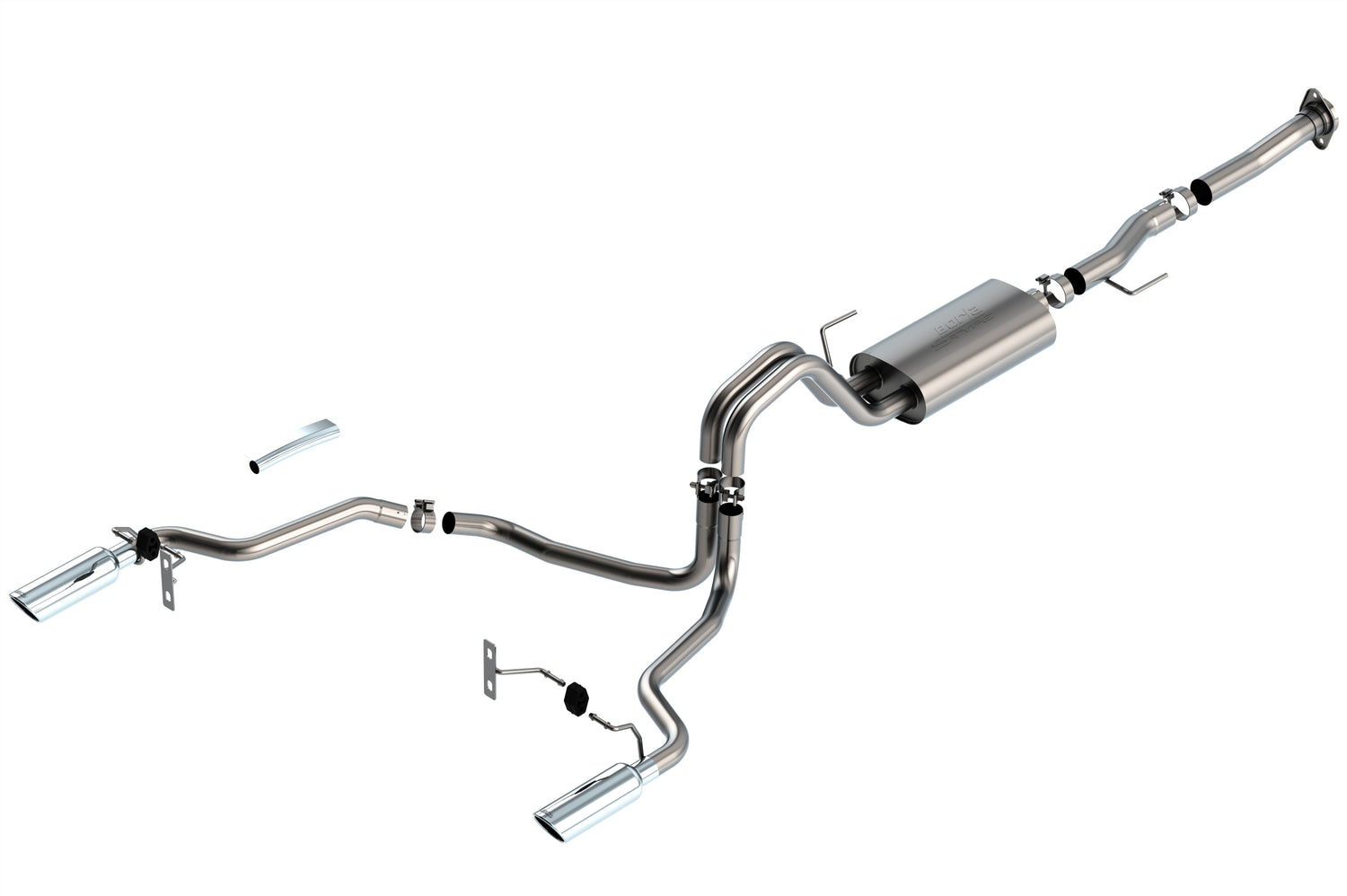 The 3" diameter into dual 2.25" Borla(r) Cat-Back(tm) system was specifically designed to enhance the power and sound of the Ford F-150 equipped with the 5.0L V8 engine. The split rear exit configuration replaces the single factory tail pipe, and has single 4" round bright chrome on T-304 stainless steel tips on each tail pipe. A system with black chrome on T-304 stainless steel tips is also available. This system features the popular S-Type sound with no drone. Additional systems are available with different options for sound level, tip finish and tip exits. Add adapter 60564 for Regular Cab with Long Bed (8' 2") 141.5" wheelbase vehicles. Borla(r) Cat-Back(tm) & Axle-Back exhaust systems feature patented straight-through and multi-core technology to unleash hidden horsepower. Increased exhaust velocity adds power, driving excitement, fuel economy, and the distinctive Borla(r) Sound of Power respected by motoring enthusiasts everywhere. Each system is built from premium, high-quality T-304 austenitic stainless steel, superior to T-400 series knockoffs (such as 409), to give you the absolute best in performance and durability. Ultra-smooth mandrel bends ensure maximum flow & power, and precision computer numerical control (CNC) manufacturing ensures an accurate fit. All this is backed by our unsurpassed Million Mile Warranty. System Features: Cat-Back(tm) System Split Rear Exit 4" Round Bright Chrome On T-304 Stainless Steel Tips S-Type Sound Level T-304 Stainless Steel Construction Bolt-On Installation Million Mile Warranty