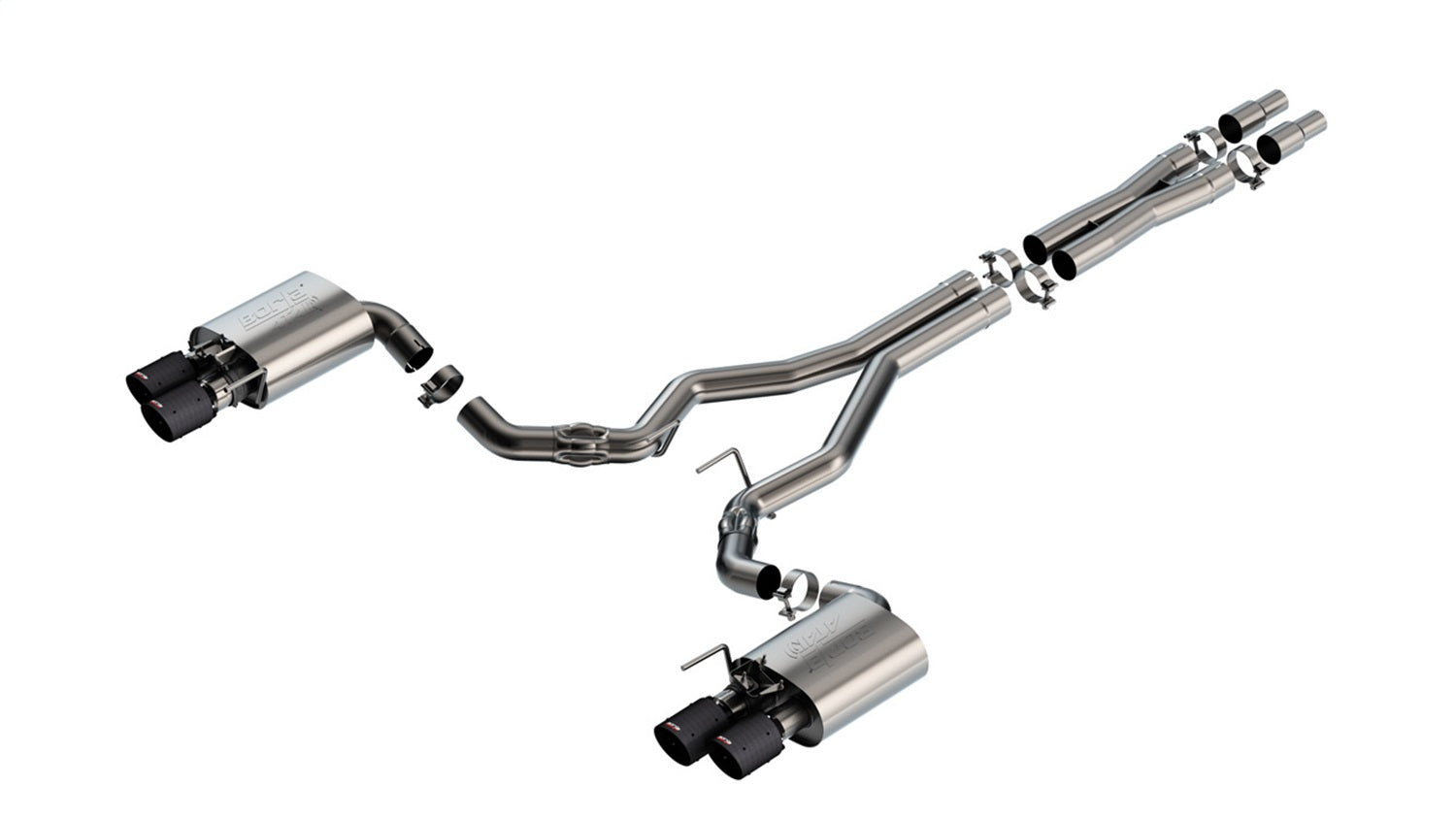 EXCEPT Convertible. This 3 in. diameter True Dual BORLA® Cat-Back™ system features a merge X-Pipe for increased performance and improved sound. This exhaust system contains active valves that retain the Active Exhaust functionality. Muffler contains Polyphonic Harmonizer technology which utilizes patented units that contain pipes of different diameters and lengths to create multiple exhaust notes that harmonize to deliver a clean, rich, full-bodied sound. It features the aggressive ATAK® sound with no drone inside the vehicle and 4 in. carbon fiber tips with black anodized centers. Systems with bright chrome on T-304 stainless steel tips, and black chrome on T-304 stainless steel tips are also available. BORLA® Cat-Back™ and Axle-Back exhaust systems feature patented straight-through and multi-core technology designed to unleash hidden horsepower. Increased exhaust velocity adds power, driving excitement, fuel economy, and the distinctive BORLA® Sound of Power respected by motoring enthusiasts everywhere. Each system is built from premium T-304 stainless steel, superior to T-400 series knockoffs (such as 409), to give you the absolute best in performance and durability. Ultra-smooth mandrel bends ensure maximum flow & power, and precision computer numerical control (CNC) manufacturing ensures an accurate fit. Best of all, BORLA® stands behind every system with a Million-Mile Warranty. Just what you'd expect from the world's most experienced (and most winning) exhaust brand.
