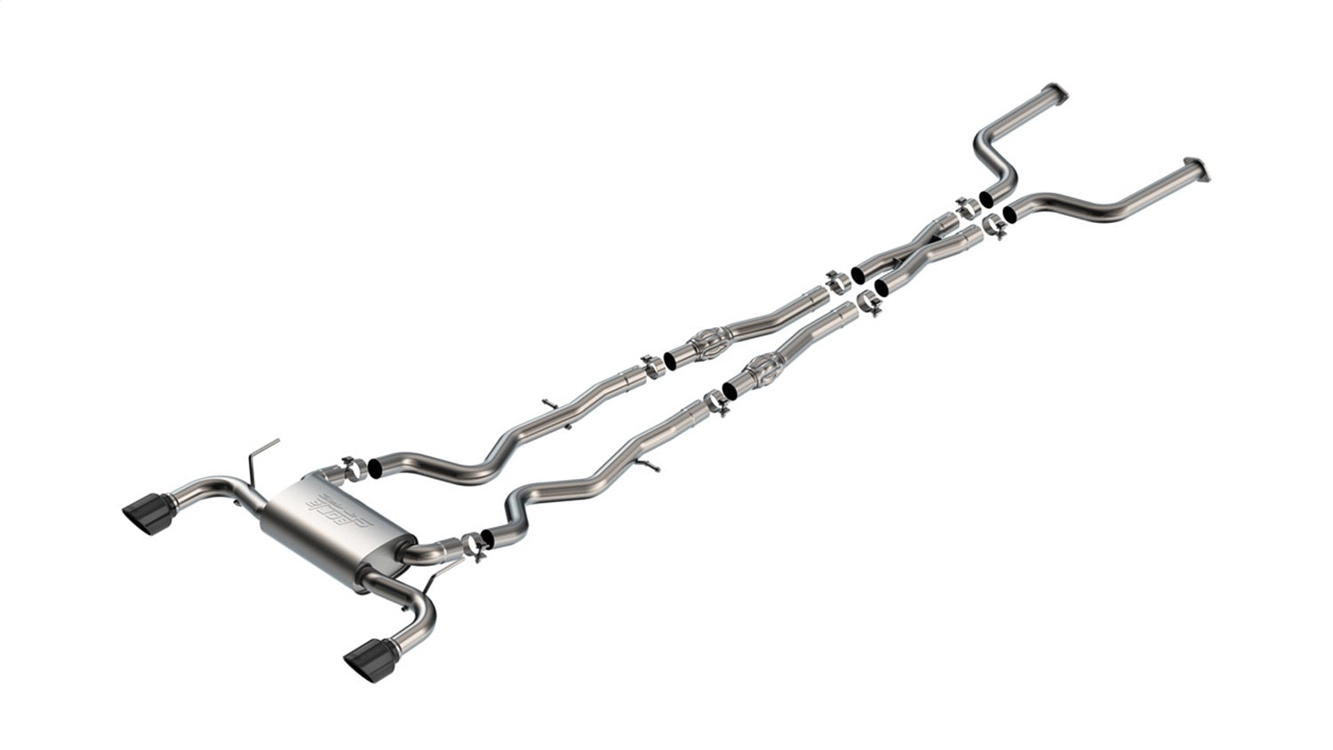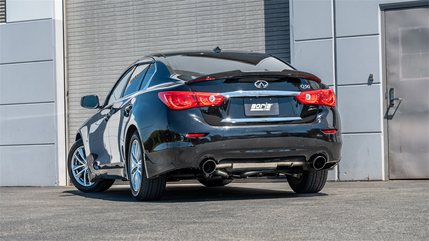 This 2.5" diameter True Dual Borla(r) Cat-Back(tm) system was designed specifically for the Q50. It features a merge X-Pipe and Borla(r)'s patented Polyphonic Harmonizer technology for increased performance and improved sound with no drone inside the vehicle. Borla(r)'s Polyphonic Harmonizer Technology utilizes patented units that contain pipes of different diameters and lengths to create multiple exhaust notes that harmonize to deliver a clean, rich, full-bodied sound. Completely eliminating the turbulent center intersection of a standard X-Pipe, The classic S-Type sound level delivers a sporty sound and a deeper tone without any drone inside the cabin. The system has a single 4.5" black chrome on T-304 stainless steel tip on each tail pipe. Using Borla(r) Stainless Steel Polish p# 21461 is NOT recommended with these black chrome tips. We suggest cleaning the tips with hot water and a microfiber cloth. Systems with bright chrome on T-304 stainless steel tips, and carbon fiber tips are also available. Borla(r) Cat-Back(tm) & Axle-Back exhaust systems feature patented straight-through and multi-core technology to unleash hidden horsepower. Increased exhaust velocity adds power, driving excitement, fuel economy, and the distinctive Borla(r) Sound of Power respected by motoring enthusiasts everywhere. Each system is built from premium, high-quality T-304 austenitic stainless steel, superior to T-400 series knockoffs (such as 409), to give you the absolute best in performance and durability. Ultra-smooth mandrel bends ensure maximum a flow & power, and precision computer numerical control (CNC) manufacturing ensures an accurate fit. Best of all, Borla(r) stands behind every system with a Million-Mile Warranty. Just what you'd expect from the worlds most experienced (and most winning) exhaust brand.