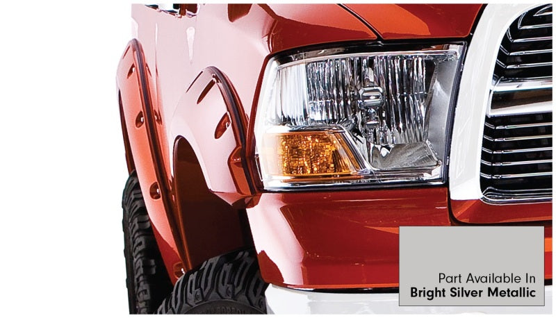 Bushwacker's rugged, iconic Pocket Style(R) Fender Flares allow for more tire coverage and more clearance for trucks and SUVs while protecting the vehicle from dirt and debris. These flares are now available pre-finished to match the paint on your new RAM 1500, plus they have the edge trim and stainless steel hardware pre-installed for quick and easy installation and a perfect fit-no drilling required . Made in the USA from sturdy Dura-Flex(R) 2000 material, these flares are warp-resistant and tailor made for each application. Despite their bolted-on appearance, these flares install easily without drilling for a secure fit. And since they're ready to install out of the box, there's no waiting on paint, and no hassle with installation.;Adds up to 2.60 in. of tire coverage, easy install;pre-finished in Bright Silver Metallic (Paint Code: PS2);Strong Dura-Flex(R) 2000 material;Limited lifetime warranty, materials & 3 yr finish;Made in the USA;Front Pair Part # 50037-02;Rear Pair Part # 50038-02;Replacement pair part numbers are matte black only