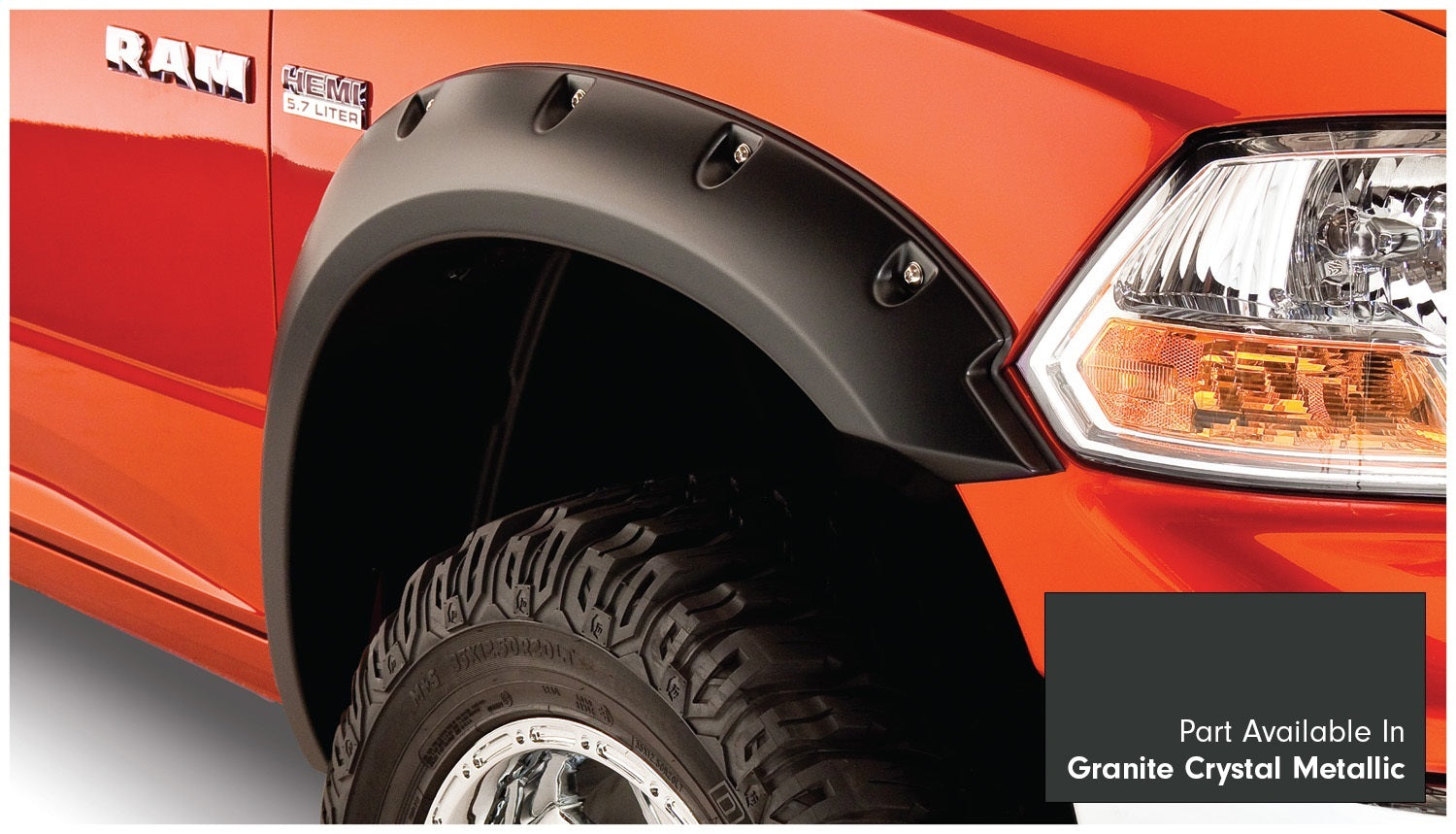 Bushwacker's rugged, iconic Pocket Style(R) Fender Flares allow for more tire coverage and more clearance for trucks and SUVs while protecting the vehicle from dirt and debris. These flares are now available pre-finished to match the paint on your new RAM 1500, plus they have the edge trim and stainless steel hardware pre-installed for quick and easy installation and a perfect fit-no drilling required . Made in the USA from sturdy Dura-Flex(R) 2000 material, these flares are warp-resistant and tailor made for each application. Despite their bolted-on appearance, these flares install easily without drilling for a secure fit. And since they're ready to install out of the box, there's no waiting on paint, and no hassle with installation.;Adds up to 2.60 in. of tire coverage, easy install;pre-finished in Granite Crystal Metallic (Paint Code: PAU);Strong Dura-Flex(R) 2000 material;Limited lifetime warranty, materials & 3 yr finish;Made in the USA;Front Pair Part # 50037-02;Rear Pair Part # 50038-02;Replacement pair part numbers are matte black only
