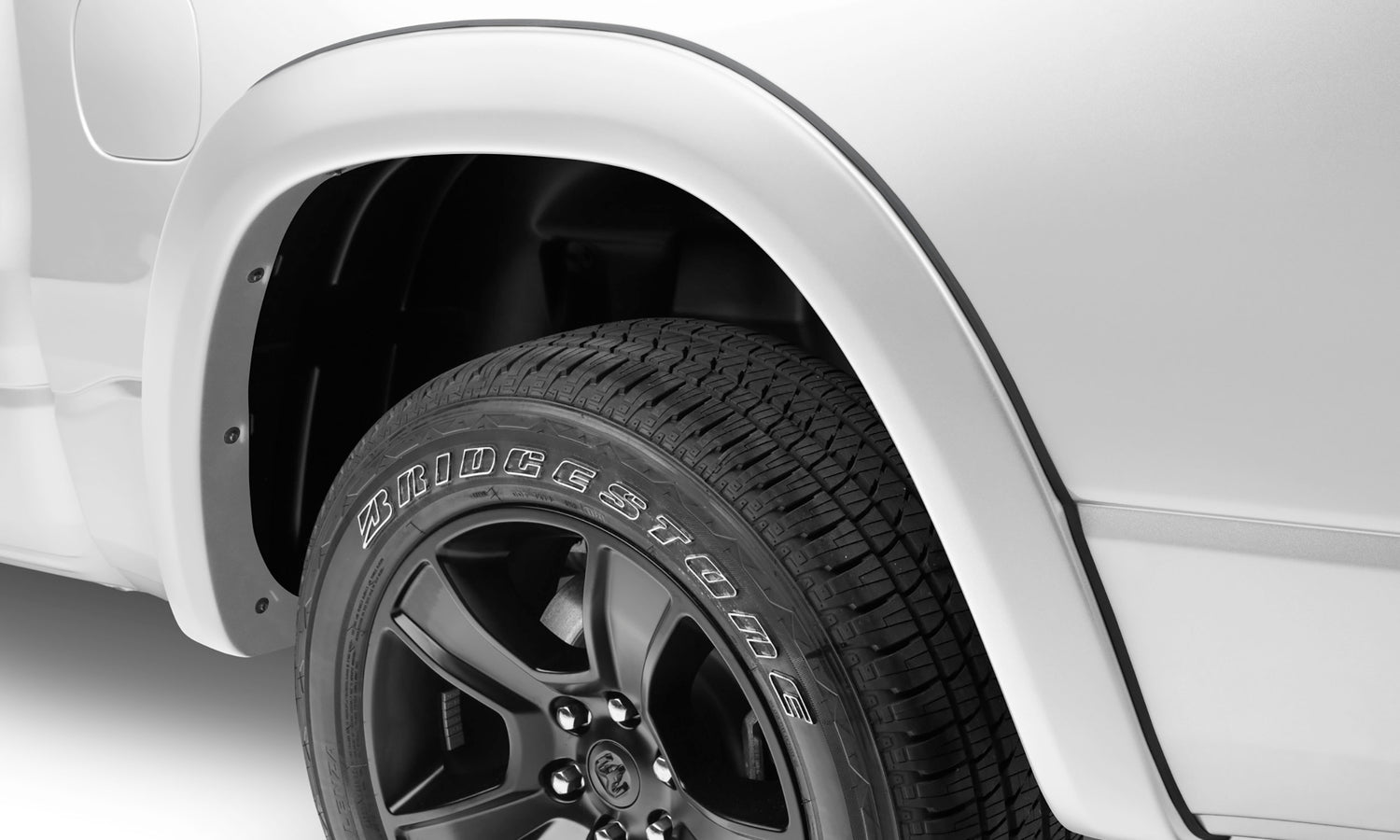 Give your Dodge Ram the appearance of an upmarket trim level with Bushwacker OE Style(R) Fender Flares. They install in minutes with only minimum drilling. And, they're designed specifically to complement your vehicles styling, so it looks like it came from the factory that way, with a fit, finish, and level of protection that exceeds original equipment. You can leave your OE Style(R) Fender Flares with their original matte black finish for a sporty, blackout look. Or, paint them to match or accent the body color for the look of limited-edition luxury or something completely customized . Your OE Style(R) Fender Flares are made with Dura-Flex(R) 2000, our exclusive material designed for upgraded durability and flexibility. They're thick too, so they wont warp. And, they're 100% UV protected, so they wont chalk. OE Style(R) Fender Flares deliver premium-grade protection with premium-level style.
