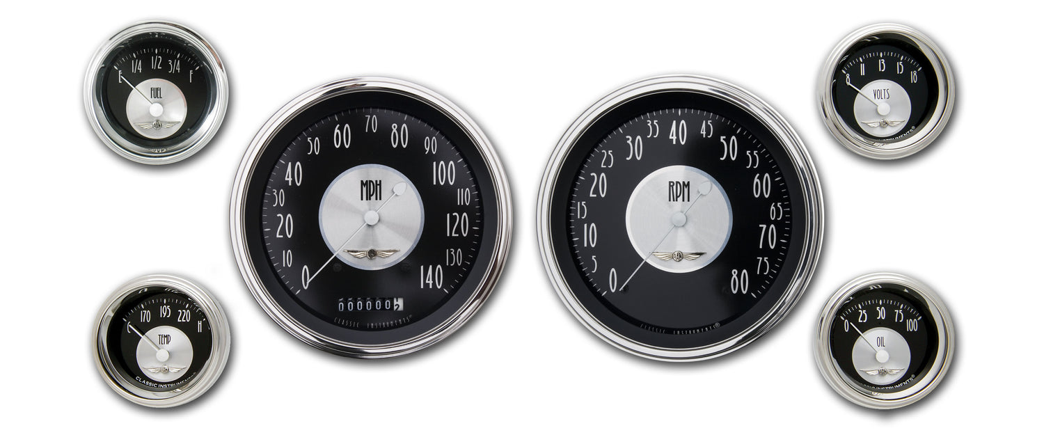 All American Tradition 4 5/8" Speedo, Tach, 2 1/8" Fuel, Oil, Temp, Volt with Stainless Low Step Bezel Curved Glass Lens