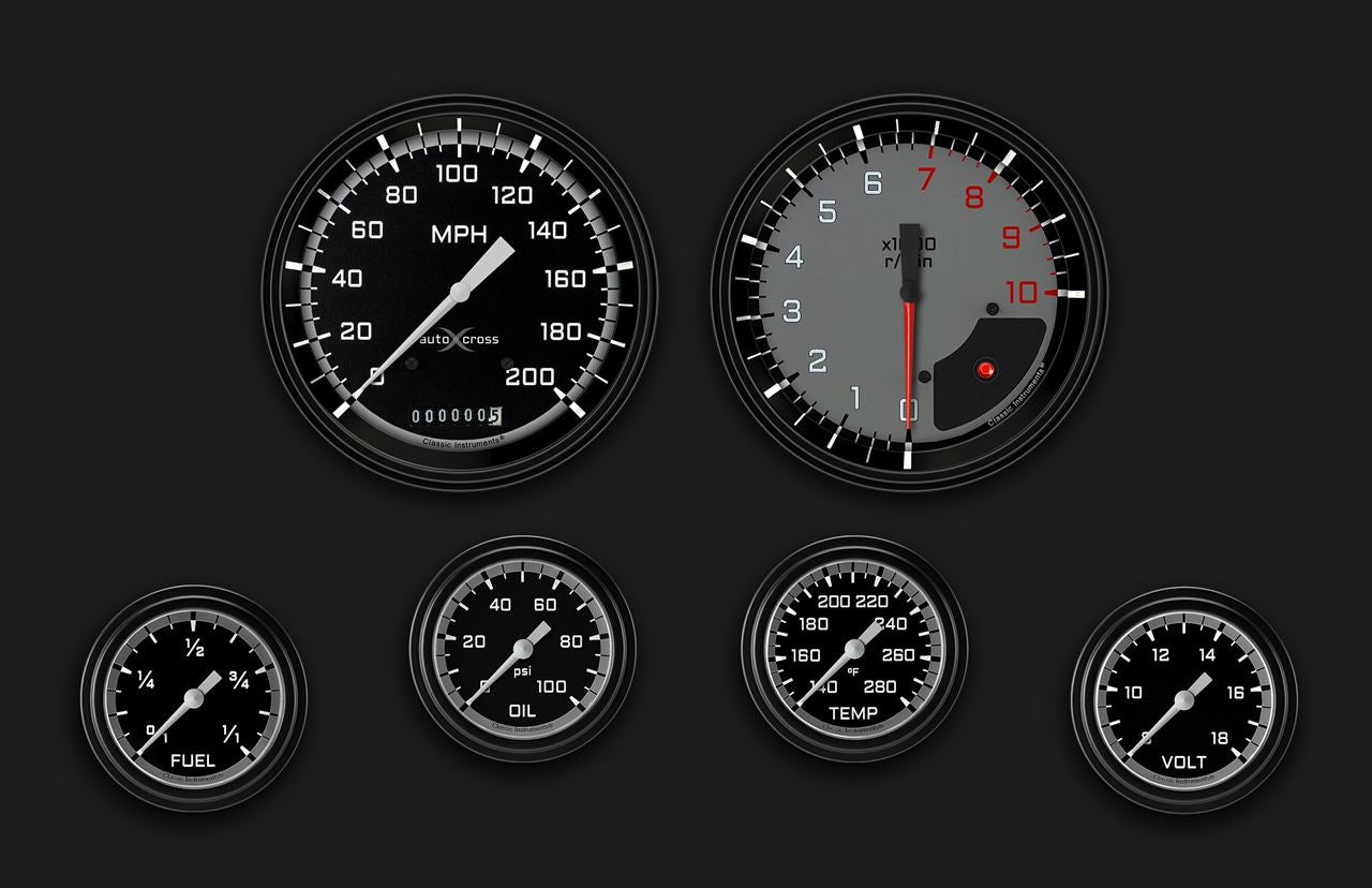 Gauge Kit - AutoCross - Analog - Fuel / Oil Pressure / Speedometer / Tachometer / Voltmeter / Water Temperature - Full Sweep - Low Step Black Bezel - Flat Lens - 4-5/8 in / 2-5/8 in Diameter - Black / Gray Face - Kit