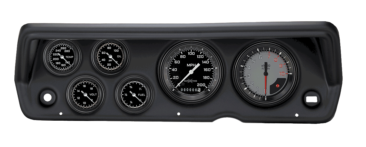 Complete assembly kit with Classic Instruments AutoCross Gray Series gauges and molded panel from Classic Dash. Panel accepts;3 3/8; speedometer and tachometer, and 2 1/8; fuel, oil, volt, and temp instruments. Speedometer and tachometer include Classic Instruments ZST™ for ease of calibration, and the ability to read pulse generator, vehicle speed sensor, or ECM signals. This kit includes Classic Instruments full-sweep small gauges.