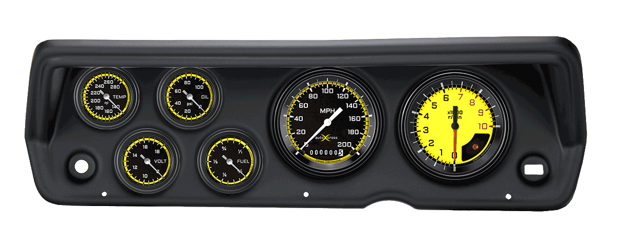 Complete assembly kit with Classic Instruments;AutoCross Yellow Series;gauges and molded;panel from Classic Dash. Panel accepts;3 3/8; speedometer;and tachometer,;and 2 1/8; fuel, oil, volt, and temp instruments.;Speedometer and tachometer include Classic Instruments ZST™ for ease of calibration, and the ability to read pulse;generator, vehicle speed sensor, or ECM signals. This kit includes Classic Instruments;full-sweep;small gauges.