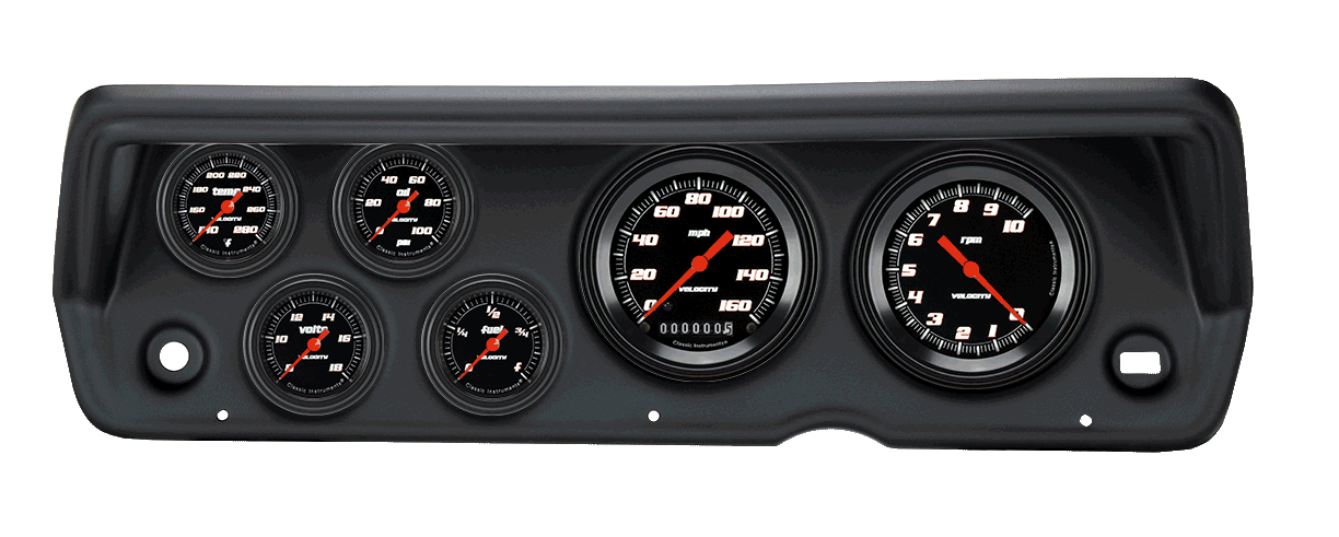 Complete assembly kit with Classic Instruments;Velocity Black Series;gauges and molded;panel from Classic Dash. Panel accepts;3 3/8; speedometer;and tachometer,;and 2 1/8; fuel, oil, volt, and temp instruments.;Speedometer and tachometer include Classic Instruments ZST™ for ease of calibration, and the ability to read pulse;generator, vehicle speed sensor, or ECM signals. This kit includes Classic Instruments;full-sweep;small gauges.