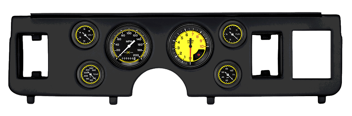 Complete assembly kit with Classic Instruments;AutoCross Yellow Series;gauges and molded;panel from Classic Dash. Panel accepts;3 3/8; speedometer;and tachometer,;and 2 1/8; fuel, oil, volt, and temp instruments.;Speedometer and tachometer include Classic Instruments ZST™ for ease of calibration, and the ability to read pulse;generator, vehicle speed sensor, or ECM signals. This kit includes Classic Instruments;full-sweep;small gauges.
