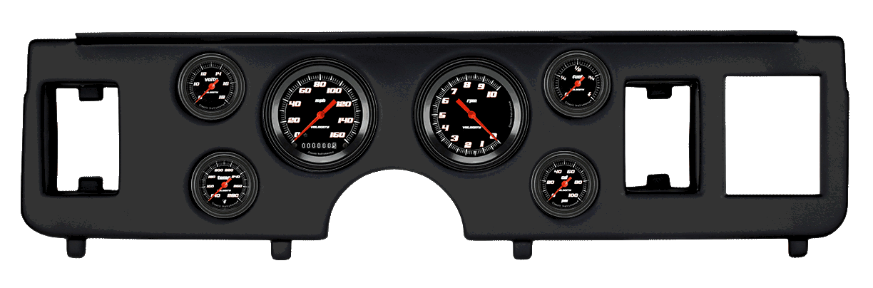 Complete assembly kit with Classic Instruments;Velocity Black Series;gauges and molded;panel from Classic Dash. Panel accepts;3 3/8; speedometer;and tachometer,;and 2 1/8; fuel, oil, volt, and temp instruments.;Speedometer and tachometer include Classic Instruments ZST™ for ease of calibration, and the ability to read pulse;generator, vehicle speed sensor, or ECM signals. This kit includes Classic Instruments;full-sweep;small gauges.