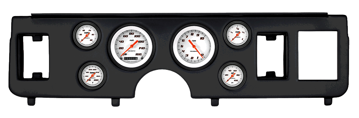 Complete assembly kit with Classic Instruments;Velocity White Series;gauges and molded;panel from Classic Dash. Panel accepts;3 3/8; speedometer;and tachometer,;and 2 1/8; fuel, oil, volt, and temp instruments.;Speedometer and tachometer include Classic Instruments ZST™ for ease of calibration, and the ability to read pulse;generator, vehicle speed sensor, or ECM signals. This kit includes Classic Instruments;full-sweep;small gauges.