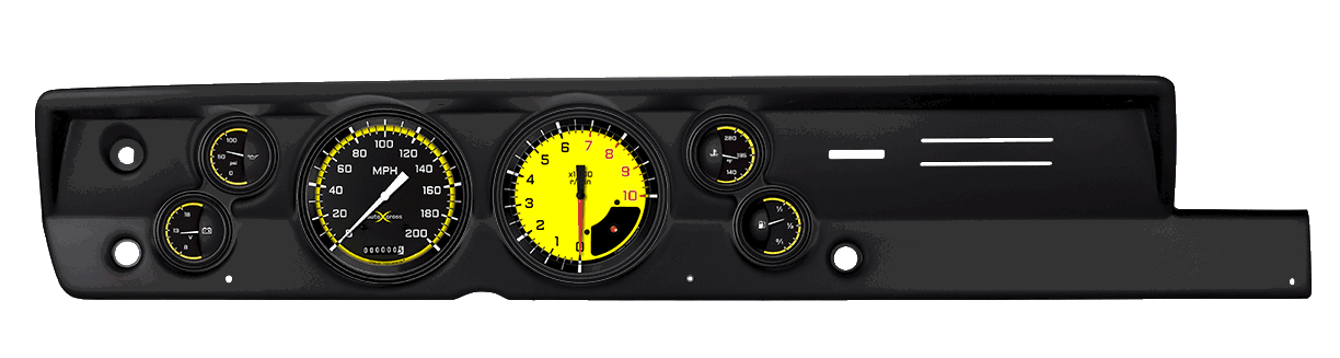 Complete assembly kit with Classic Instruments;AutoCross Yellow Series;gauges and molded;panel from Classic Dash. Panel accepts 4 5/8; speedometer;and tachometer,;and 2 1/8; fuel, oil, volt, and temp instruments.;Speedometer and tachometer include Classic Instruments ZST™ for ease of calibration, and the ability to read pulse;generator, vehicle speed sensor, or ECM signals. This kit includes Classic Instruments short-sweep;small gauges.
