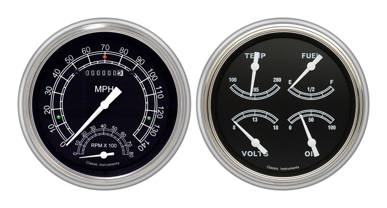 1951-52 Chevy Car Package Traditional Series 4 5/8" Speedtachular (Speedometer/Tachometer Combination;with built-in ECM filter signal switch) & Quad (Fuel 0-30 OHM) with Stainless Low Step Bezel Flat Glass Lens.;The package includes model specific trim rings and mounting brackets with green LED turn signals and red high beam indicator light. All necessary sending units are included.;