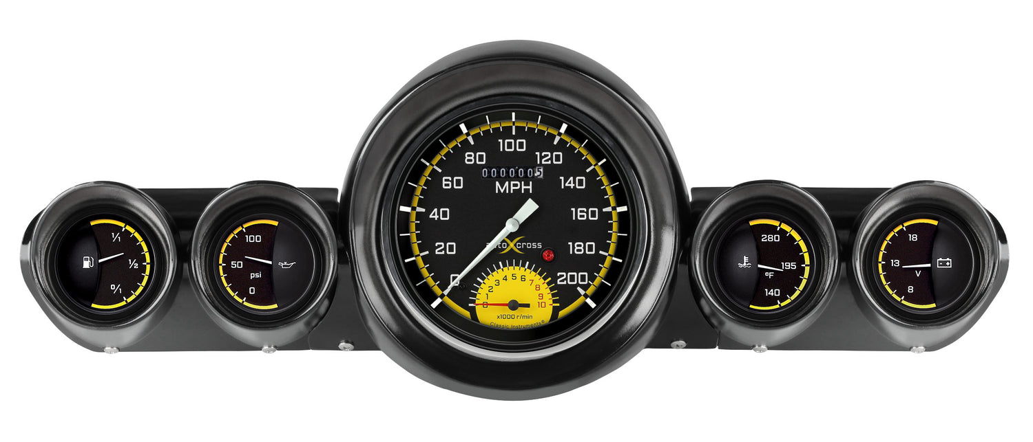 1959-60 Full Size Chevy Package Auto Cross Yellow 4 5/8" Speedtachular (Speedometer/ Tachometer Combination;with built-in ECM filter signal switch) & 2 1/8" Fuel, Oil, Temp, Volt with Stainless Low Step Bezel.;Includes red LED high beam and green turn signal indicators mounted in face of speedometer.;