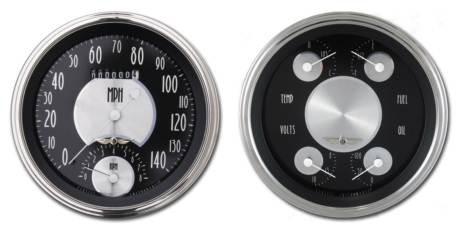 1947-53 All American Tradition Truck Package features a 4 5/8" Speedtachular (Speedo/Tach combination gauge) and Quad (Fuel, Oil, Temp, Volt combination gauge) with stainless low step bezels and flat glass lenses.