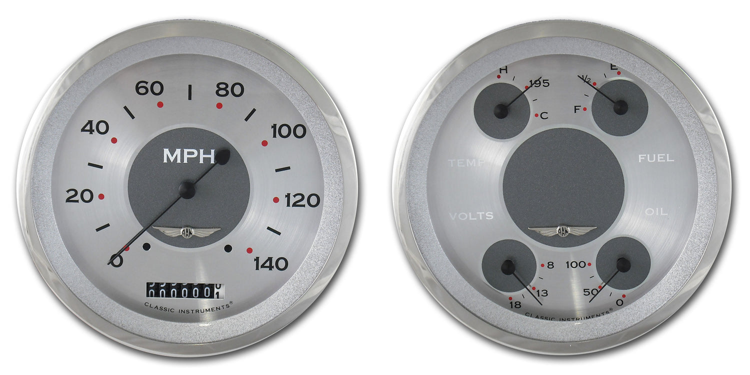 1947-53 All American Truck Package features a 4 5/8" Speedometer and Quad (Fuel, Oil, Temp, Volt combination gauge) with stainless low step bezels and flat glass lenses.