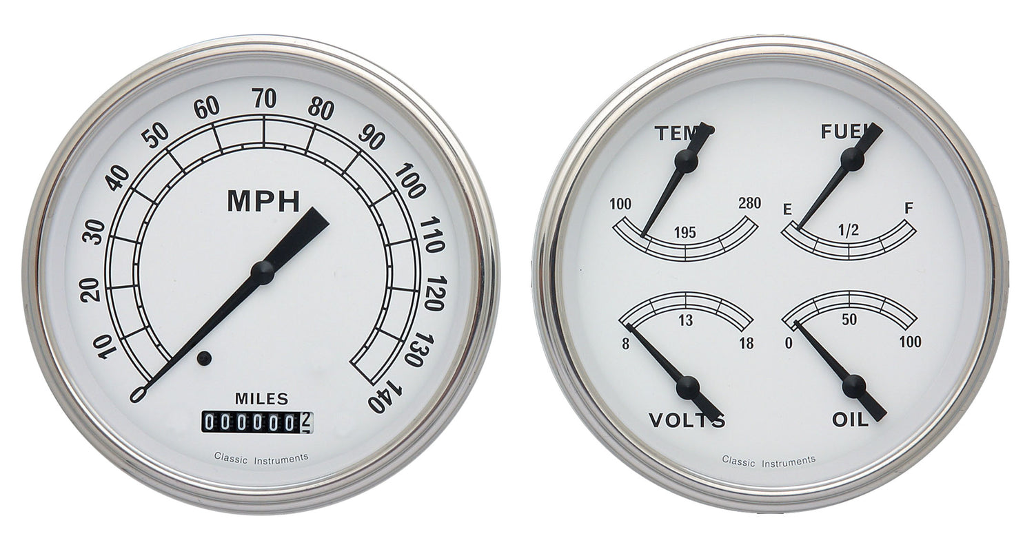 1947-53 Classic White Truck Package features a 4 5/8" Speedometer and Quad (Fuel, Oil, Temp, Volt combination gauge) with stainless low-step bezels and flat glass lenses.