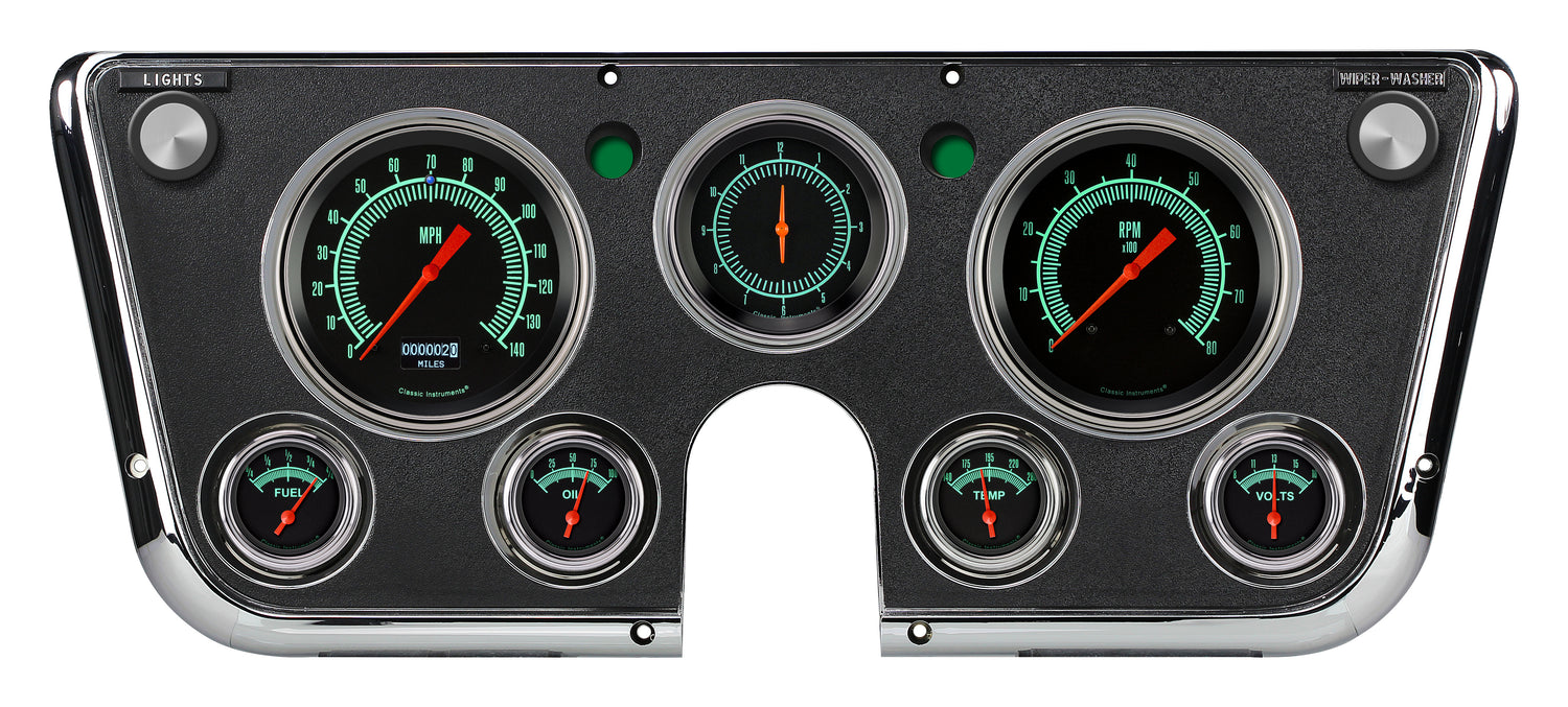 The 1967-72 Chevy Truck Package with our G/Stockl Series installed, features a 4 5/8 Speedometer and tachometer, 3 3/8 Clock, and 2 1/8 Fuel (0-90 OHM), Oil, Temp, and Volt gauges. A blue LED high-beam indicator is installed in the speedometer. The set includes pre-wired electrical connections, mounting hardware, all necessary* sending units, and a wiring harness constructed of automotive grade TXL wire, machine-crimped terminals, tech-flex sleeving, and Molex main connectors. It is equipped with our ZST and works directly with ECM or VSS signals so no additional control box is needed. *Fuel sending unit not included, fuel gauge is calibrated to stock 0-90 OHM. **Dash bezel not included.