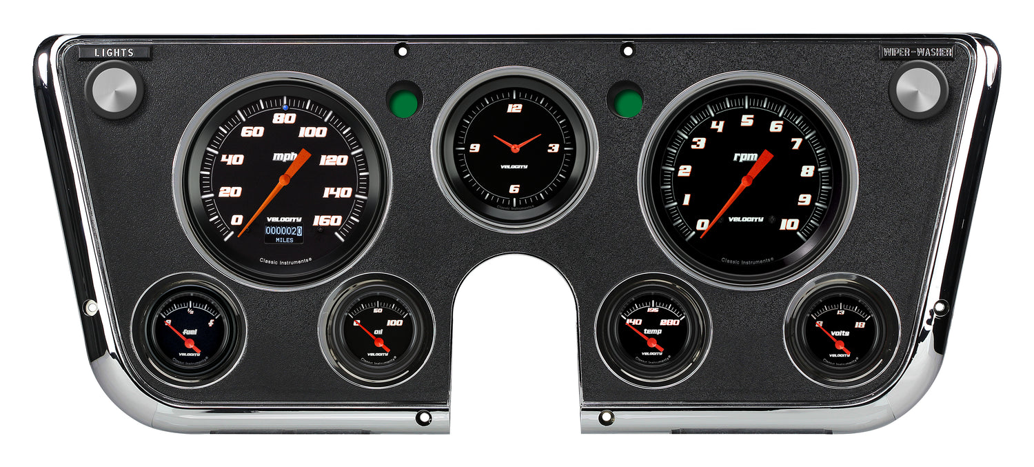 The 1967-72 Chevy Truck Package with our;Velocity Black Series installed, features a 4 5/8" digital Information Screen;Speedometer and tachometer, 3 3/8" Clock, and 2 1/8" Fuel (0-90 OHM), Oil, Temp, and Volt gauges. A blue LED high beam indicator is installed in the speedometer.;The set includes pre-wired electrical connections, mounting hardware, all necessary* sending units, and a wiring harness;constructed of automotive grade TXL wire, machine-crimped terminals, tech-flex sleeving, and Molex main connectors. It is equipped with our ZST™ and works directly with ECM or VSS signals so no additional control box is needed.
