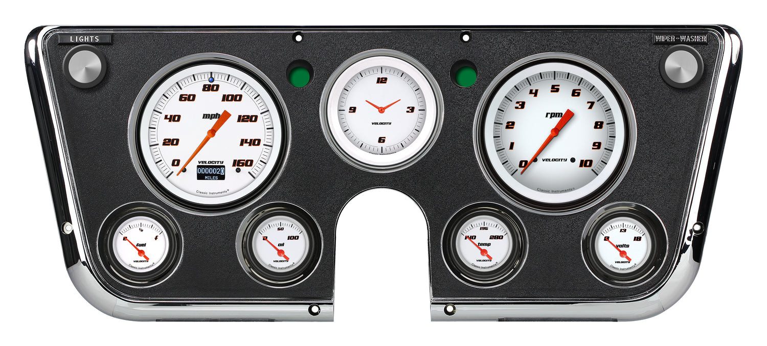 The 1967-72 Chevy Truck Package with our Velocity White Series installed, features a 4 5/8 Speedometer and tachometer, 3 3/8 Clock, and 2 1/8 Fuel (0-90 OHM), Oil, Temp, and Volt gauges. A blue LED high-beam indicator is installed in the speedometer. The set includes pre-wired electrical connections, mounting hardware, all necessary* sending units, and a wiring harness constructed of automotive grade TXL wire, machine-crimped terminals, tech-flex sleeving, and Molex main connectors. It is equipped with our ZST and works directly with ECM or VSS signals so no additional control box is needed. *Fuel sending unit not included, fuel gauge is calibrated to stock 0-90 OHM. **Dash bezel not included.