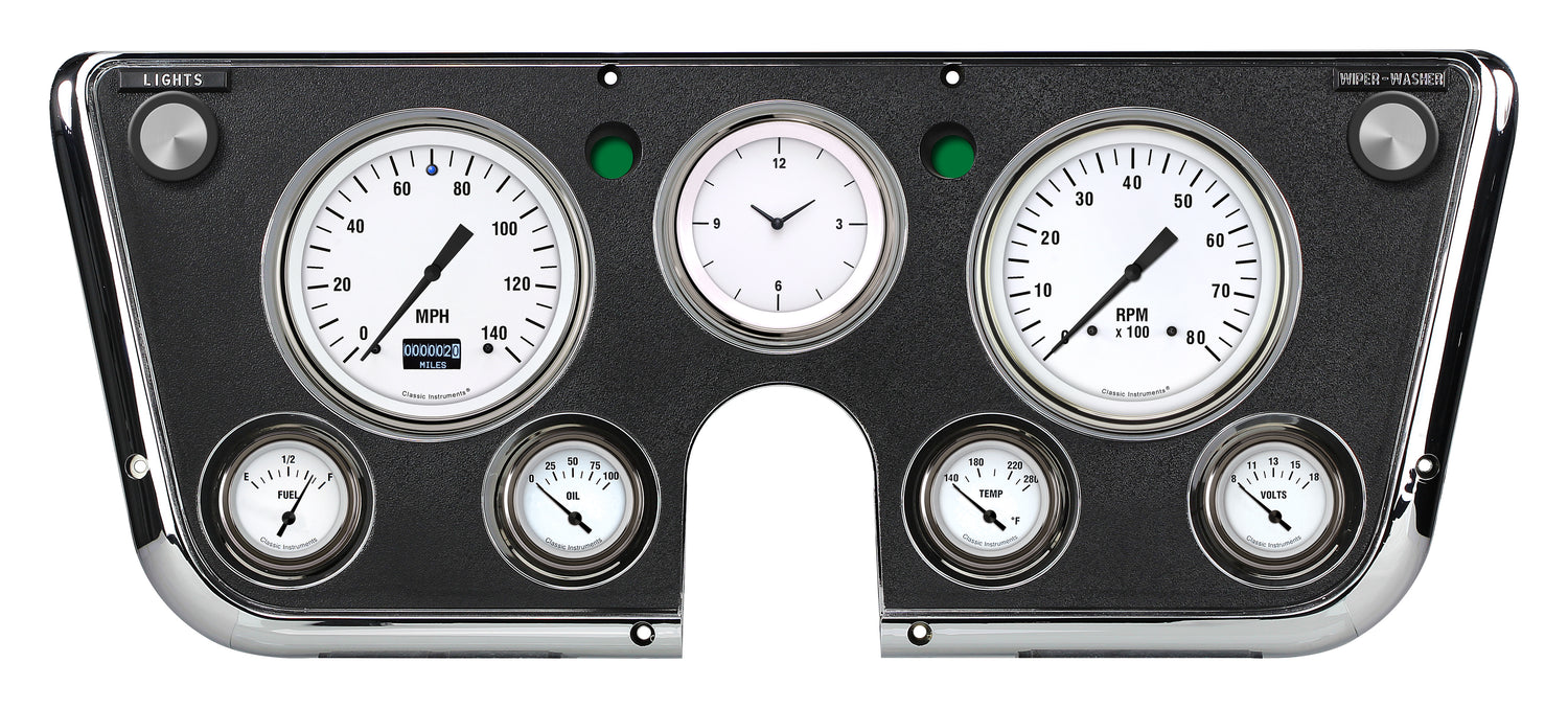 The 1967-72 Chevy Truck Package with our White Hot Series installed, features a 4 5/8 Speedometer and tachometer, 3 3/8 Clock, and 2 1/8 Fuel (0-90 OHM), Oil, Temp, and Volt gauges. A blue LED high-beam indicator is installed in the speedometer. The set includes pre-wired electrical connections, mounting hardware, all necessary* sending units, and a wiring harness constructed of automotive grade TXL wire, machine-crimped terminals, tech-flex sleeving, and Molex main connectors. It is equipped with our ZST and works directly with ECM or VSS signals so no additional control box is needed. *Fuel sending unit not included, fuel gauge is calibrated to stock 0-90 OHM. **Dash bezel not included.