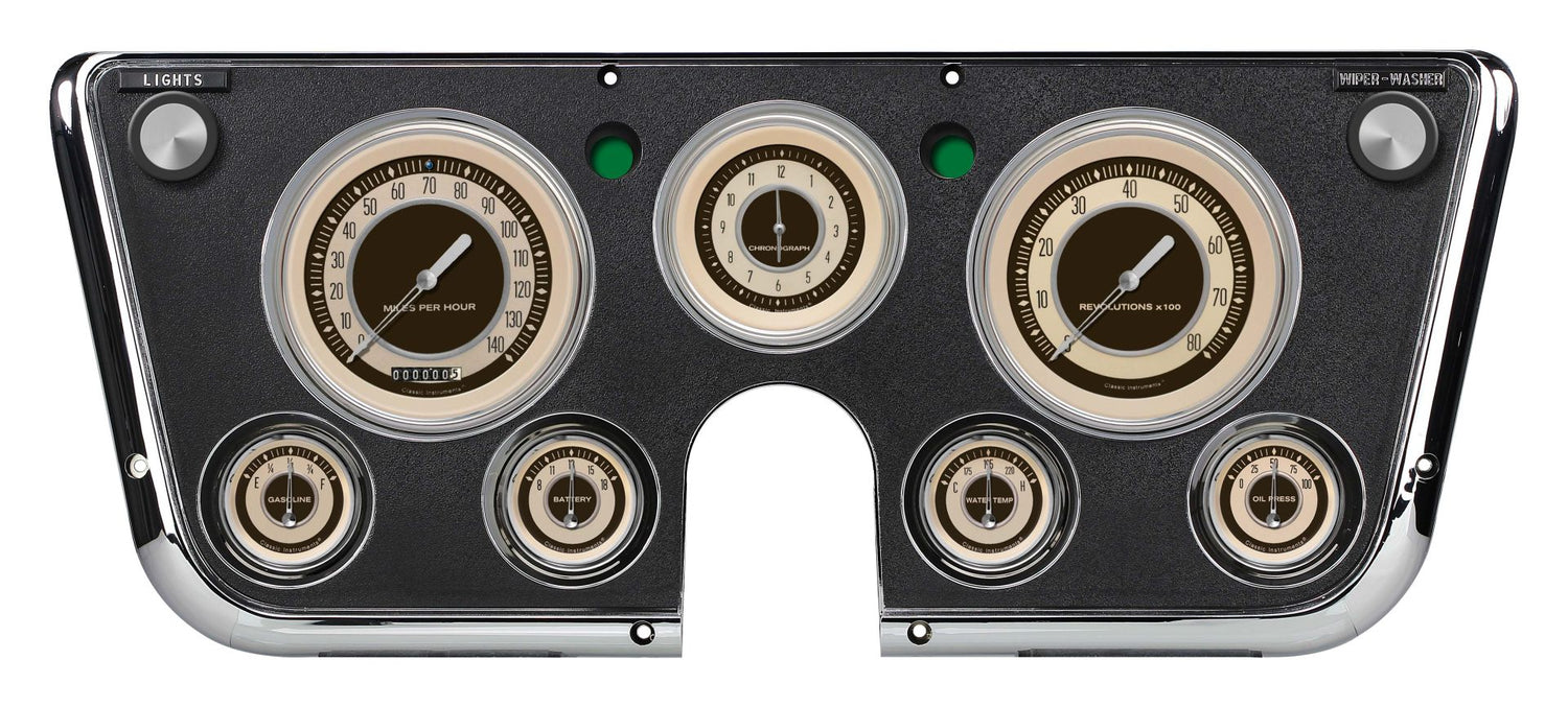 The 1967-72 Chevy Truck Package with our Nostalgia VT Series installed, features a 4 5/8 Speedometer and tachometer, 3 3/8 Clock, and 2 1/8 Fuel (0-90 OHM), Oil, Temp, and Volt gauges. A blue LED high-beam indicator is installed in the speedometer. The set includes pre-wired electrical connections, mounting hardware, all necessary* sending units, and a wiring harness constructed of automotive grade TXL wire, machine-crimped terminals, tech-flex sleeving, and Molex main connectors. It is equipped with our ZST and works directly with ECM or VSS signals so no additional control box is needed. *Fuel sending unit not included, fuel gauge is calibrated to stock 0-90 OHM. **Dash bezel not included.
