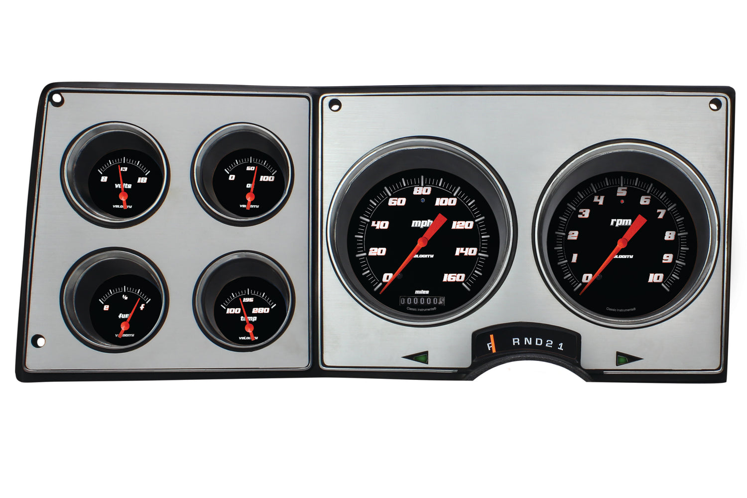The Velocity Black 1973-87 Chevy/GMC direct-fit cluster features a speedometer and tachometer, and fuel, oil, temperature, and volt gauges in our bold Velocity Black series. The all-electric cluster arrives ready to install directly into the stock dash of 73-87 trucks, Suburbans, and Blazers, with ease. Simply replace the factory connector with the new connector included in the kit. It is designed to re-use the factory dash bezel and gear indicator to maintain the nostalgic integrity of the vehicle, and features an injection-molded light blue housing for a factory appearance. Additionally, the turn signals are in the stock location and it is designed so light reaches the gear indicator.;Everything needed to install the package is provided in the kit including a new lens and all necessary sending units.;It features our ZST™ and works directly with ECM or VSS signals requiring no additional control boxes. The cluster is designed to reuse the stock fuel sending unit or any aftermarket fuel sender (purchased separately) with the built-in ohm range selector switch. Whether you want to freshen up your stock look, or call us for customizations to make it your very own, our 1973-87 Chevy/GMC direct-fit cluster offers the perfect seamless installation you desire. ;