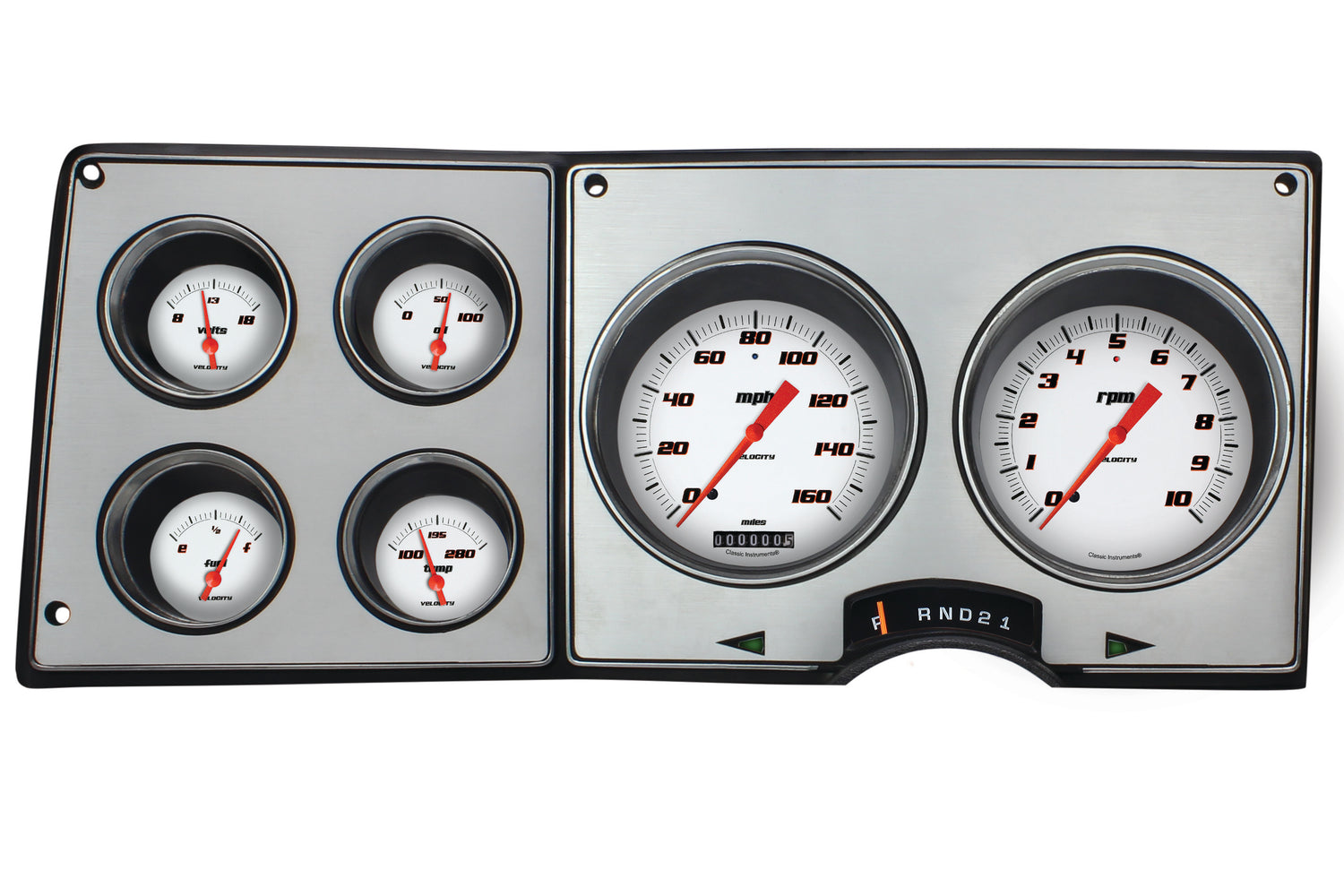 The Velocity White 1973-87 Chevy/GMC direct-fit cluster features a speedometer and tachometer, and fuel, oil, temperature, and volt gauges in our Velocity White series. The all-electric cluster arrives ready to install directly into the stock dash of 73-87 trucks, Suburbans, and Blazers, with ease. Simply replace the factory connector with the new connector included in the kit. It is designed to re-use the factory dash bezel and gear indicator to maintain the nostalgic integrity of the vehicle, and features an injection-molded light blue housing for a factory appearance. Additionally, the turn signals are in the stock location and it is designed so light reaches the gear indicator.;Everything needed to install the package is provided in the kit including a new lens and all necessary sending units.;It features our ZST™ and works directly with ECM or VSS signals requiring no additional control boxes. The cluster is designed to reuse the stock fuel sending unit or any aftermarket fuel sender (purchased separately) with the built-in ohm range selector switch. Whether you want to freshen up your stock look, or call us for customizations to make it your very own, our 1973-87 Chevy/GMC direct-fit cluster offers the perfect seamless installation you desire. ;