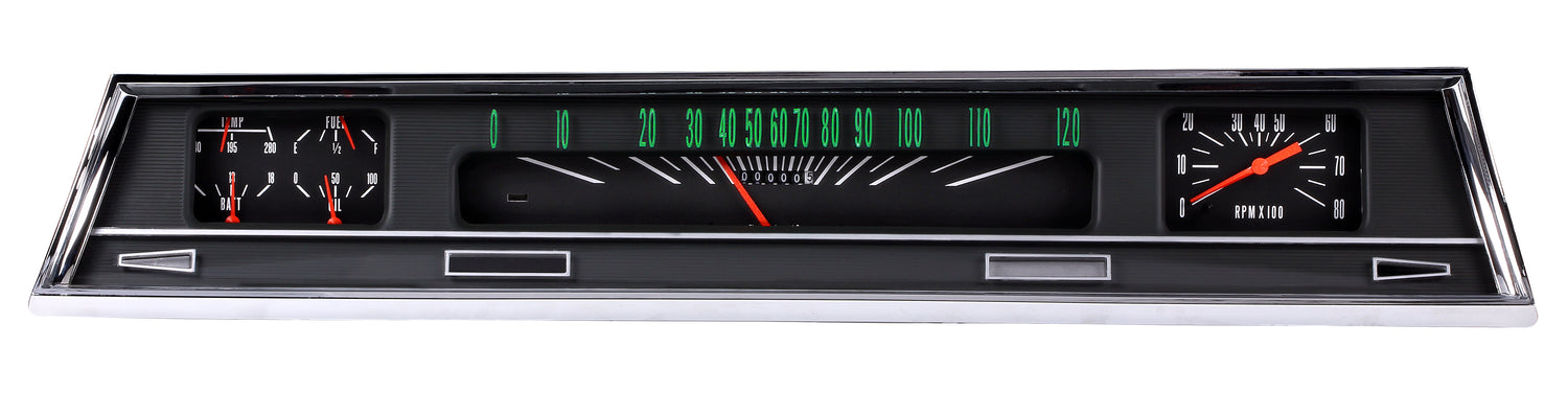 The 1966-67 Chevelle direct-fit cluster in black features a speedometer and tachometer, and fuel, oil, temperature, and volt gauges. The all-electric cluster arrives ready to install directly into the stock dash of 66-67 Chevelles, with ease. Additionally, the turn signals and high beam indicator are in the stock locations and it also features a built-in shift light and warning light. Everything needed to install the package is provided in the kit including all necessary sending units. It features our ZST™ and works directly with ECM or VSS signals requiring no additional control boxes. The cluster is designed to reuse the stock fuel sending unit or any aftermarket fuel sender (purchased separately) with the built-in ohm range selector switch. Whether you want to freshen up your stock look, or call us for customizations to make it your very own, our 1966-67;Chevelle direct-fit cluster offers the perfect seamless installation you desire. This cluster also fits 66-67 El Caminos!