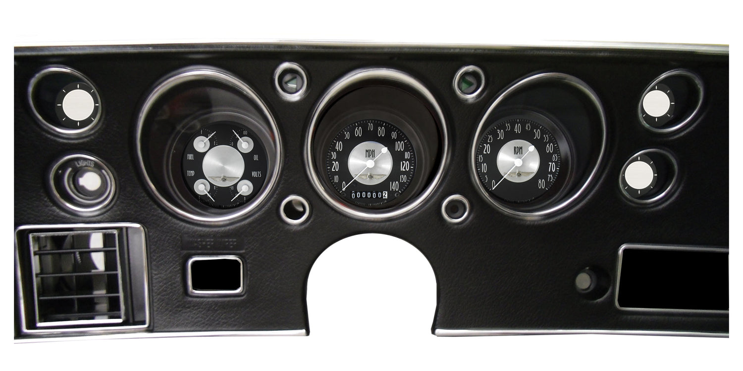The 1970-72 Chevelle SS Package with All American Traditional Series installed, features a 3 3/8 Speedometer, Tachometer, & Quad (Fuel 0-90 OHM) gauges mounted in a reproduction dash carrier and is ready to install into your existing* dash bezel with your existing lens. Set includes mounting hardware, necessary** sending units, and a wiring harness constructed of automotive grade TXL wire, machine-crimped terminals, tech-flex sleeving, and Molex main connectors. It is equipped with our ZST and works directly with ECM or VSS signals so no additional control box is needed. Also fits El Camino SS and Monte Carlo SS. Package is specific to SS model trim levels only and will not fit standard models. *Dash bezel and lens not included **Fuel sending unit not included, fuel gauge is calibrated to stock 0-90 OHM