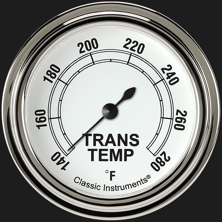 Classic White;2 5/8" Full sweep Transmission Temperature gauge with standard stainless steel;low step bezel and flat glass lens. See available bezel, lens, and pointer upgrades in the appropriate drop-down menus.