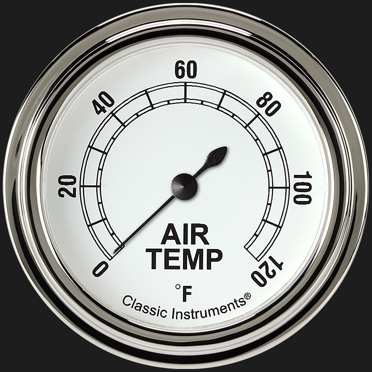 Classic White 2 5/8" Full sweep Outside Air Temp;gauge, with standard stainless steel low step bezel and flat glass lens. See available bezel, lens, and pointer upgrades in the appropriate drop-down menus.