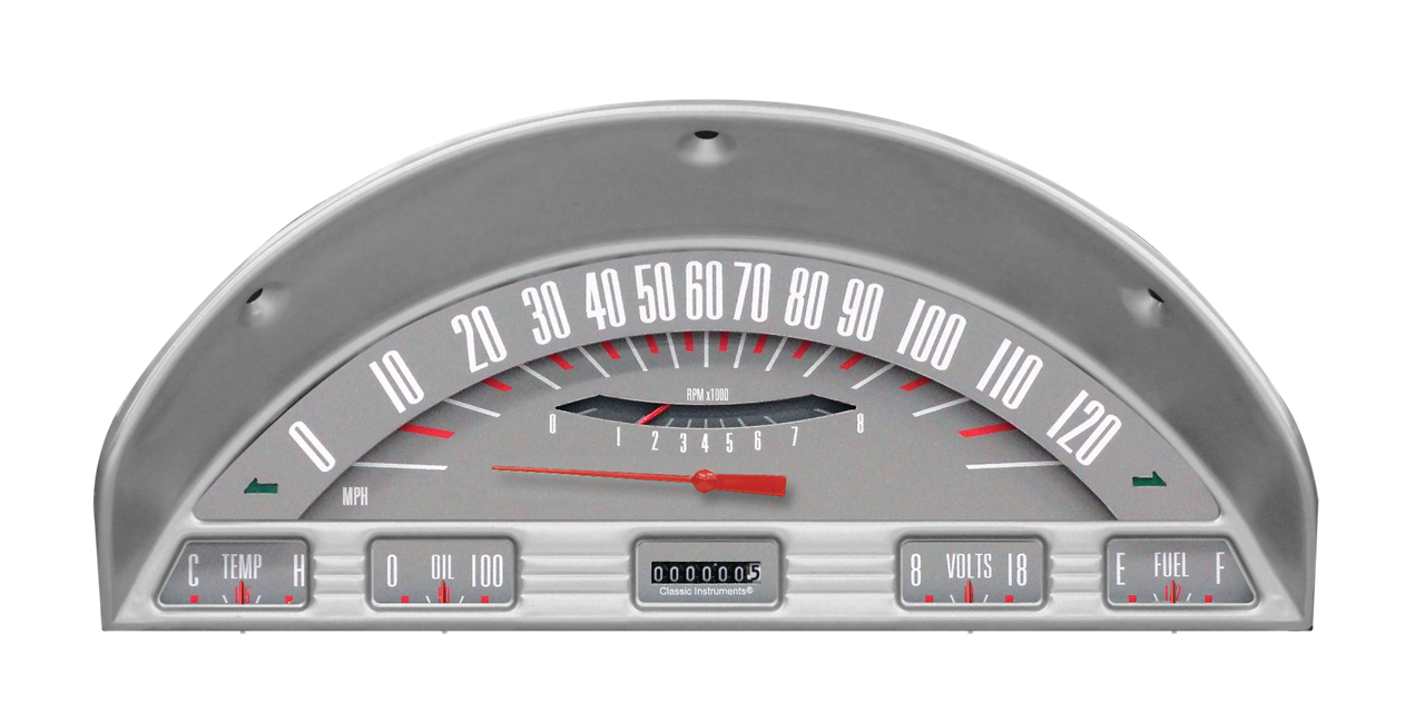 1956 Ford F-100 Truck Package Gray 6-in-One package includes 120 MPH Speedometer, 8,000 RPM Tachometer, Fuel (75-10 OHM), Oil, Temp, and Volt. The completely assembled unit includes housing, wiring harness and all necessary sending units. Features push button calibration, LED illumination, integrated turn signals and a red Halo high beam indicator. It features our ZST™ so it does not require any additional control boxes.