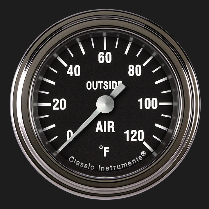 Hot Rod 2 1/8" Full sweep Outside Air Temp.;gauge with standard stainless low step bezel and flat glass lens. See available bezel, lens, and pointer upgrades in the appropriate drop-down menus.