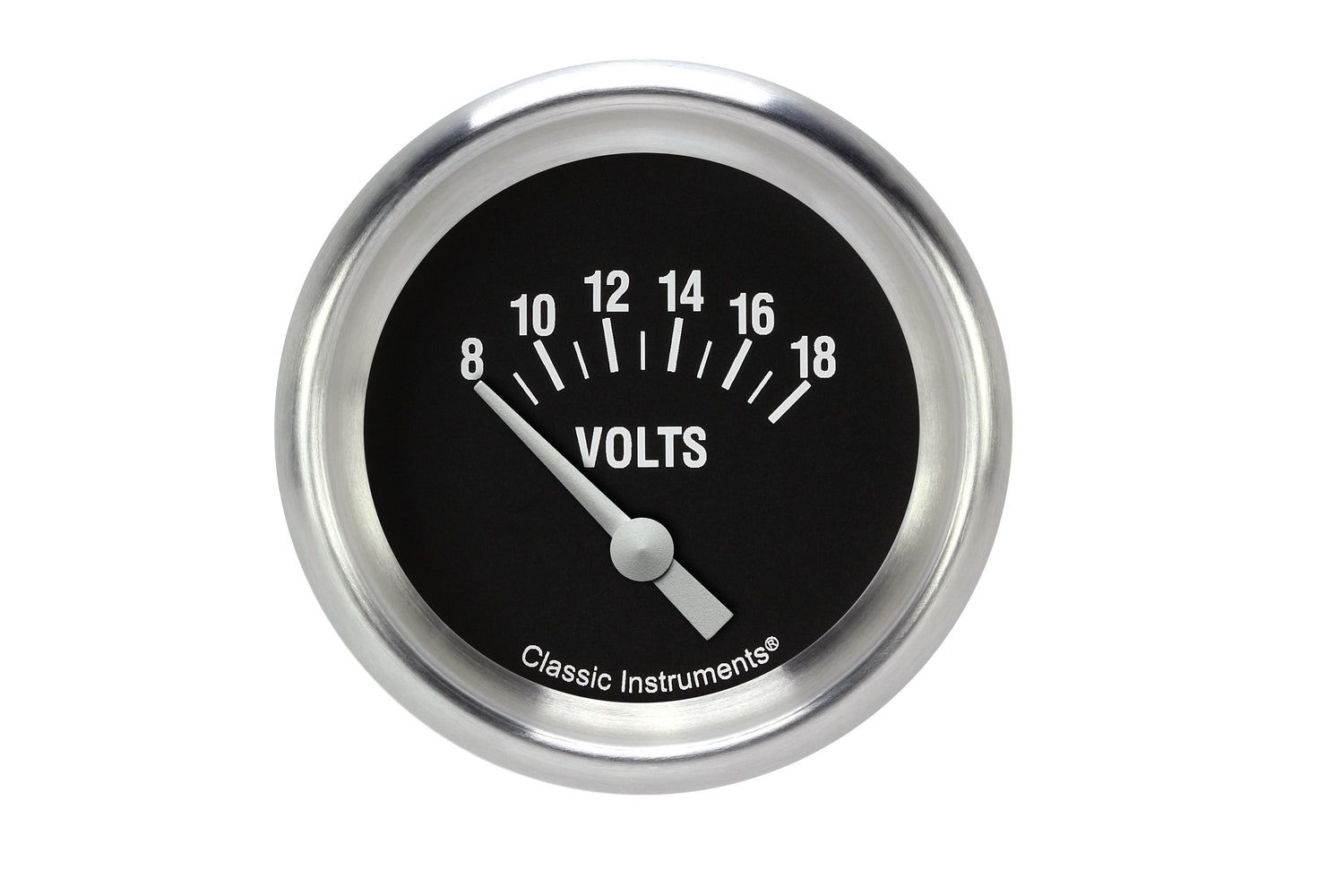 Voltmeter - Hot Rod - 8-18 Volts - Electric - Analog - Short Sweep - 2-5/8 in Diameter - Aluminum Bezel - Flat Lens - Black Face - Each