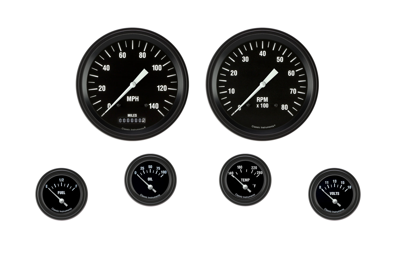 - Hot Rod Series 5" Speedo, Tach, 2 1/8" Fuel, Oil, Temp, Volt with Black Low Step Bezel Flat Glass Lens