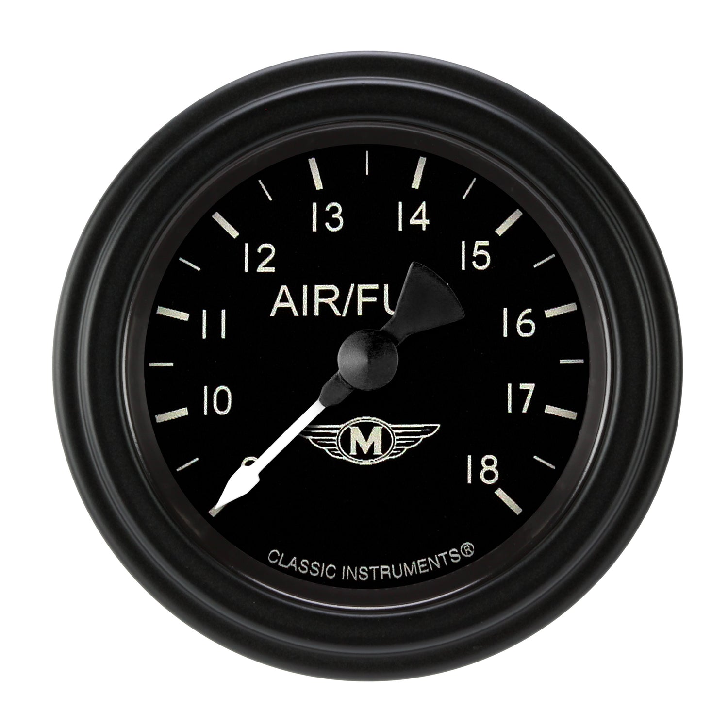 - Moal Bomber 2 1/8" Full sweep Air Fuel Ratio gauge, with standard matte-black low step bezel and flat glass lens