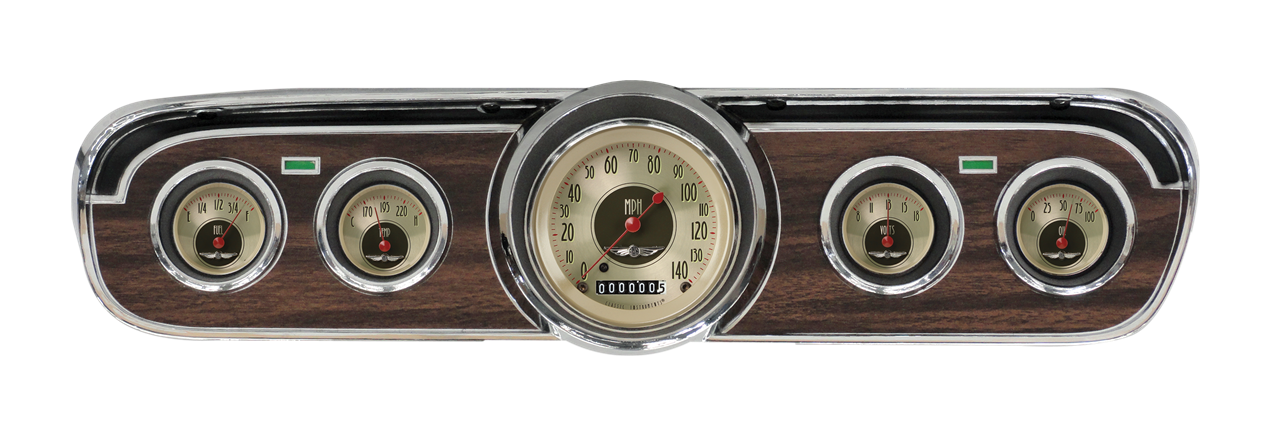 1965-66 Mustang Package All American Nickel Series 3 3/8" Speedometer, 2 1/8" Fuel (75-10 OHM), Oil, Temp, and Volt. Red Halo high beam indicator installed in the speedometer. The package is complete with necessary sending units, turn signal bulbs, and a gauge mounting bracket designed to work with your existing stock or reproduction bezel.