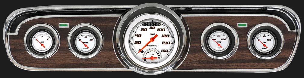 1965-66 Mustang Package Velocity Series White 3 3/8" Ultimate (Speedometer/Tachometer Combination; with built-in ECM filter signal switch), 2 1/8" Fuel (75-10 OHM), Oil, Temp, and Volt. Red Halo high beam indicator installed in the speedometer. The package is complete with necessary sending units, turn signal bulbs, and a gauge mounting bracket designed to work with your existing stock or reproduction bezel.
