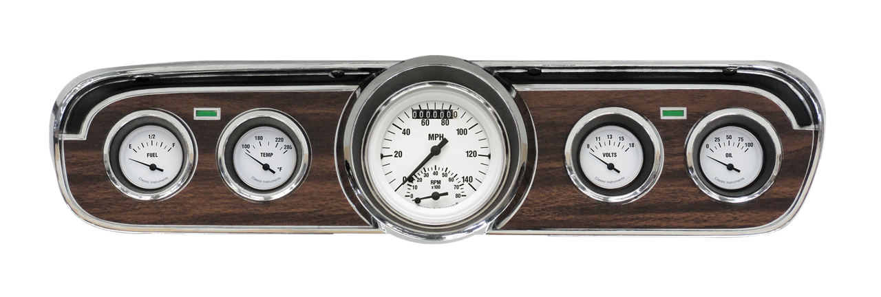 1965-66 Mustang Package White Hot Series 3 3/8" Ultimate (Speedometer/Tachometer Combination; with built-in ECM filter signal switch), 2 1/8" Fuel (75-10 OHM), Oil, Temp, and Volt. Red Halo high beam indicator installed in the speedometer. The package is complete with necessary sending units, turn signal bulbs, and a gauge mounting bracket designed to work with your existing stock or reproduction bezel.
